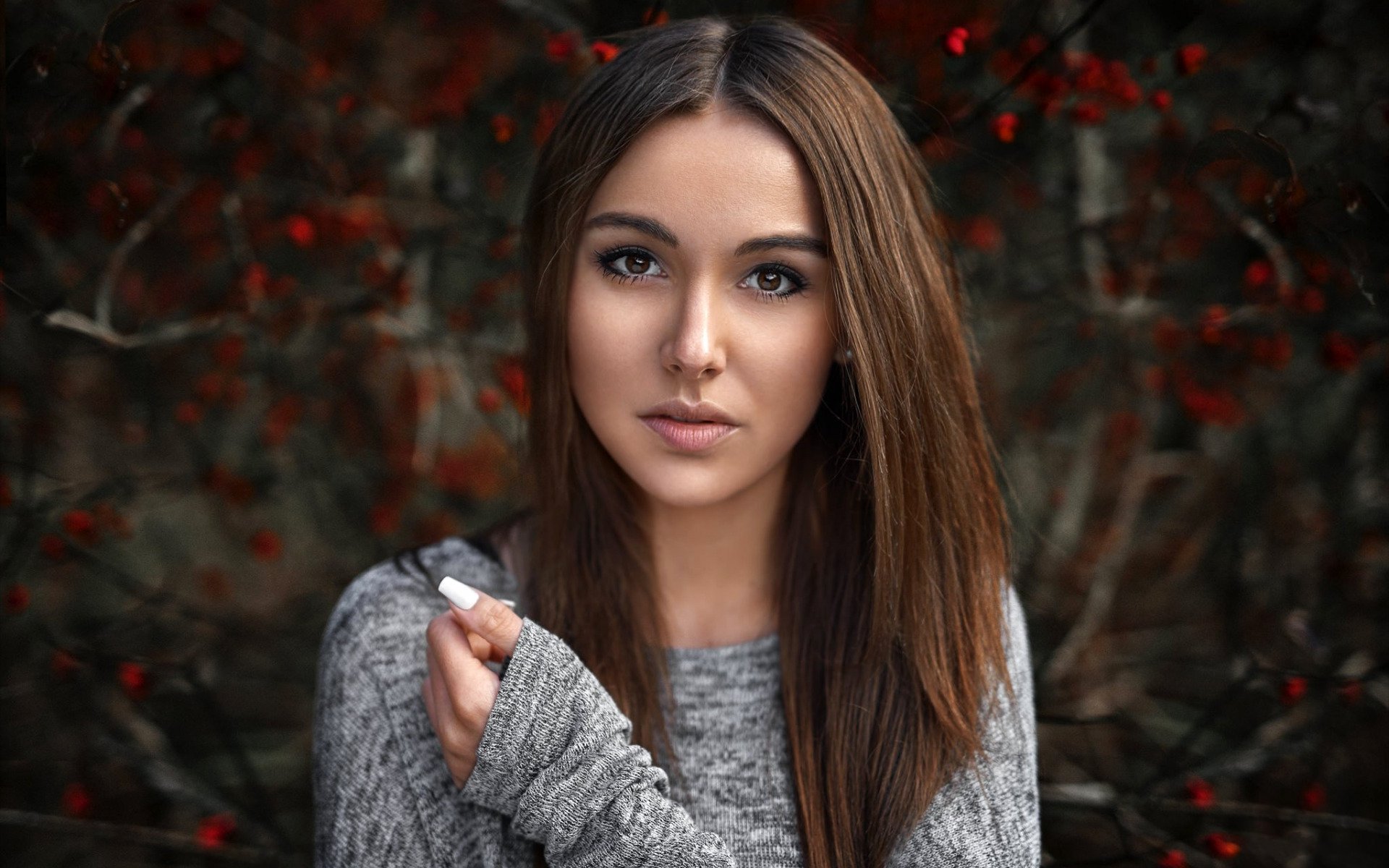 Description: A woman with long hair holding a cigarette in her hand and looking at the camera with a serious look on her face.