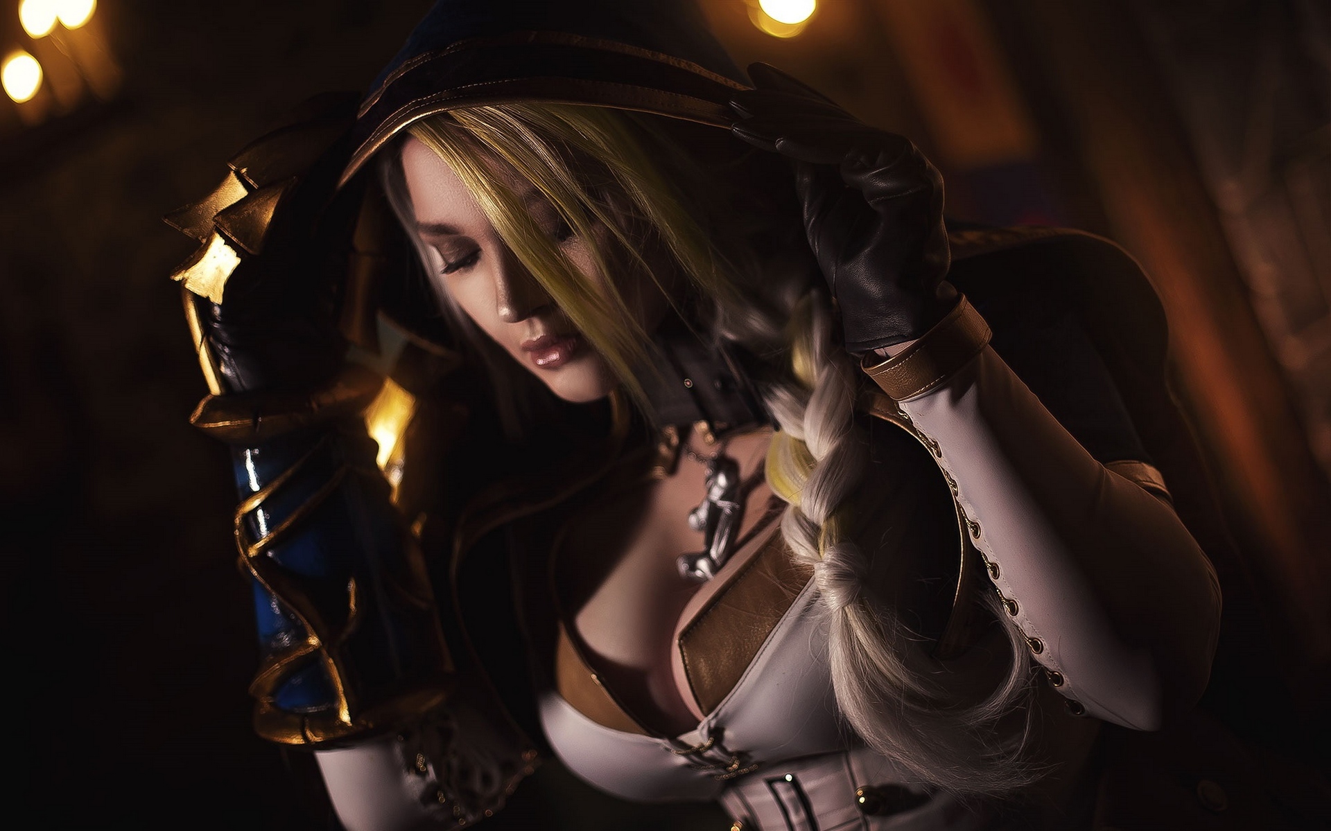 Description: A woman dressed in a costume holding a sword in a dark room with lights on the ceiling and a lamp on the wall.