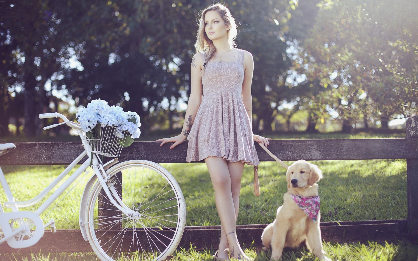 Description: A woman in a dress standing next to a bike and a dog on a leash with a basket of flowers.
