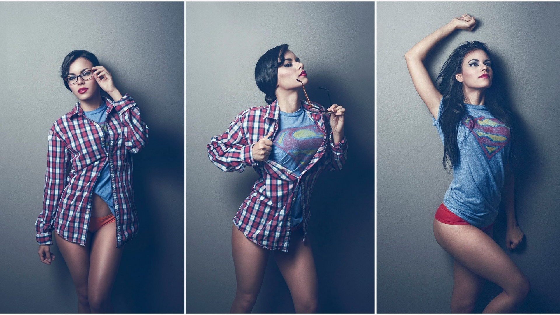 Description: A woman posing in a shirt and shorts with her hands on her hips and her arm behind her head.