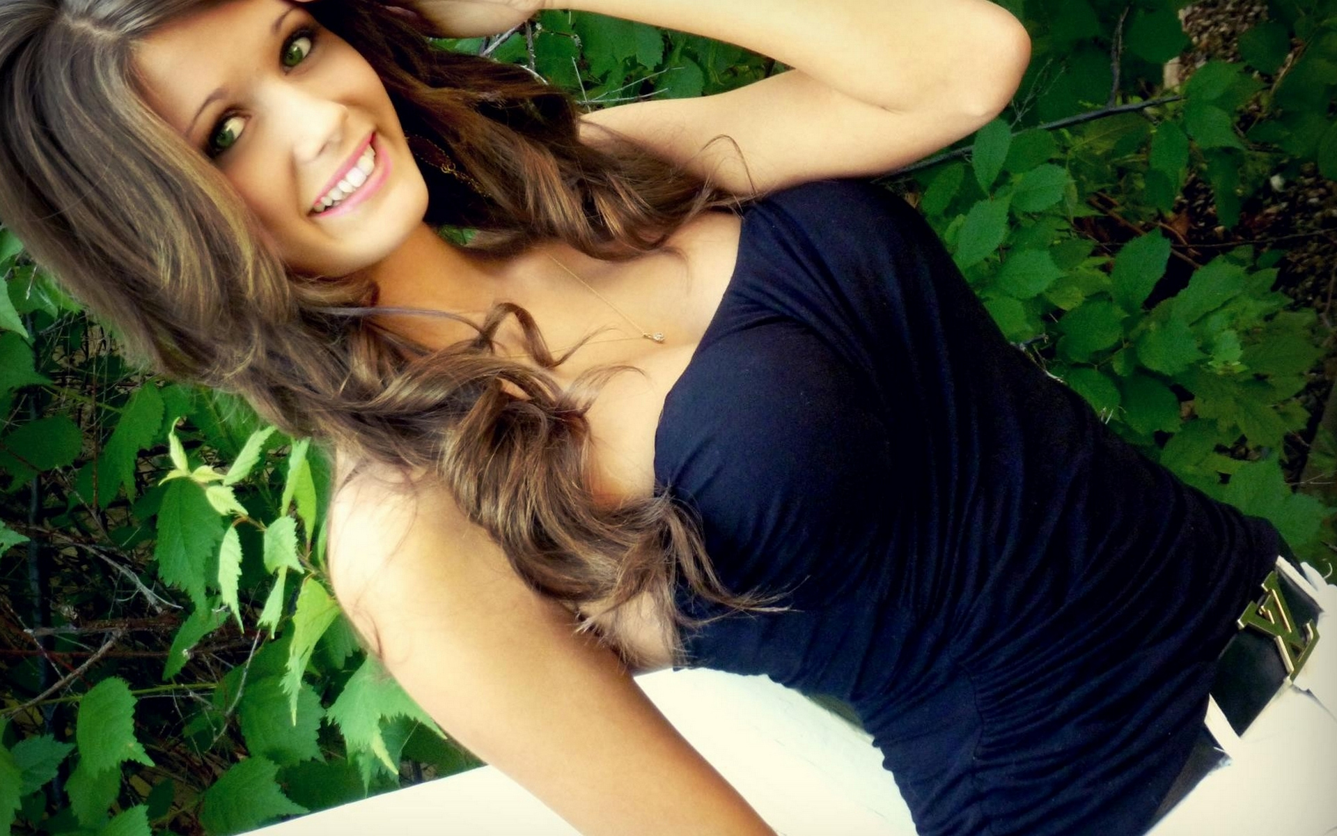 Description: A woman in a black top posing for a picture with her hair blowing in the wind and green leaves behind her.