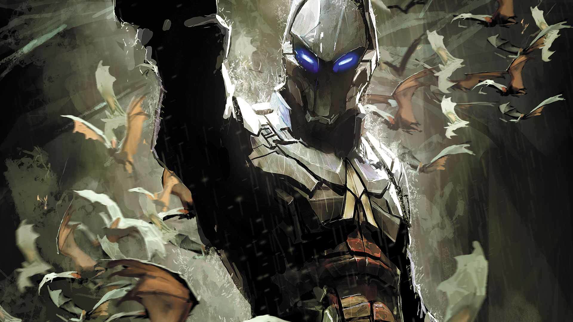 Description: A man in armor with blue eyes standing in the rain with a sword in his hand and a bird in his hand.