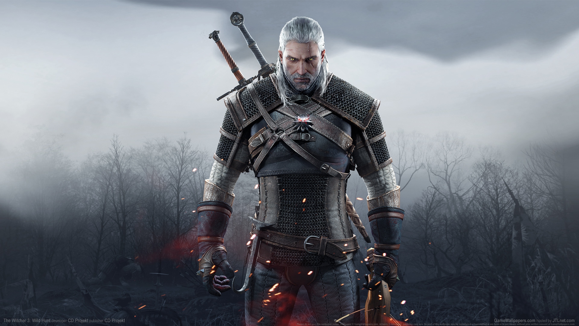 Description: A man in armor standing in a forest with two swords in his hands and a sword in his hand.