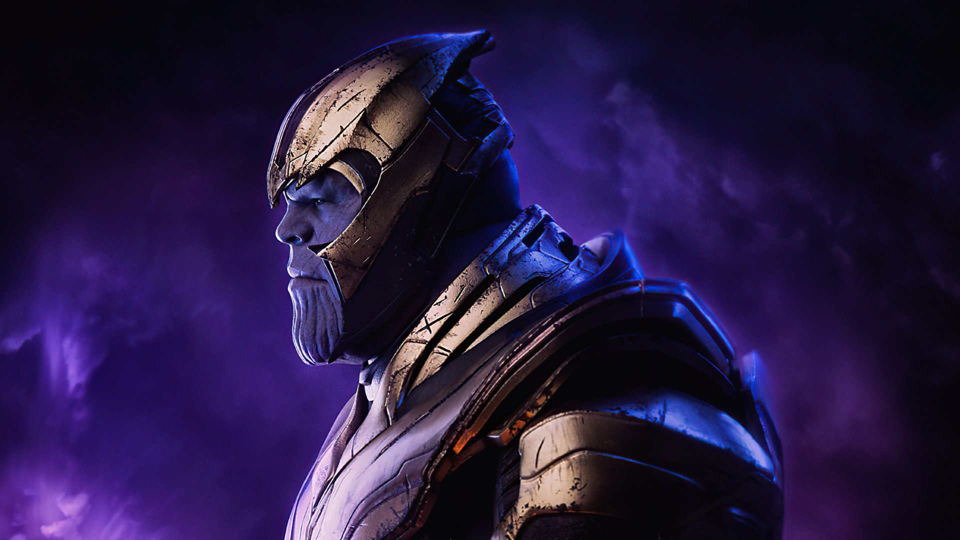 Description: A man in a suit of armor standing in front of a purple background with clouds and lightnings in the sky.