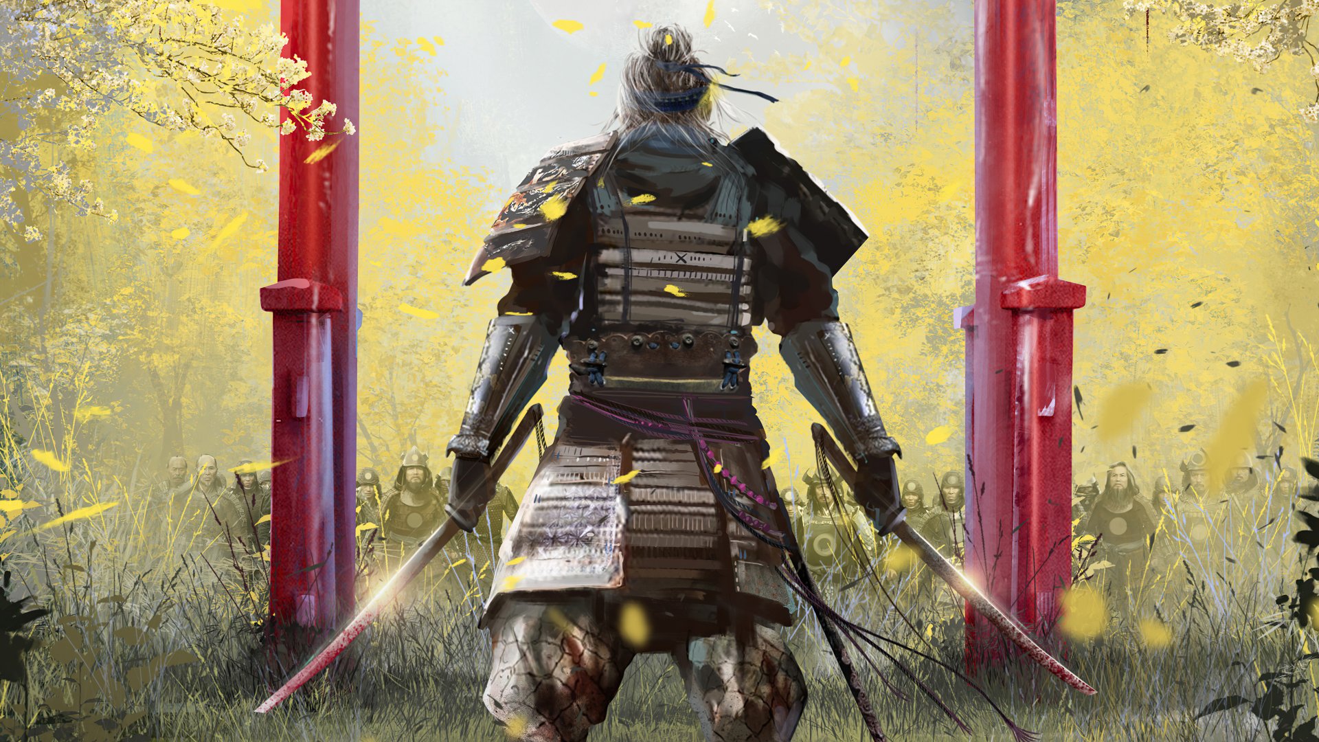 Description: A man in armor standing in a field with two swords in his hand and a yellow background behind him.