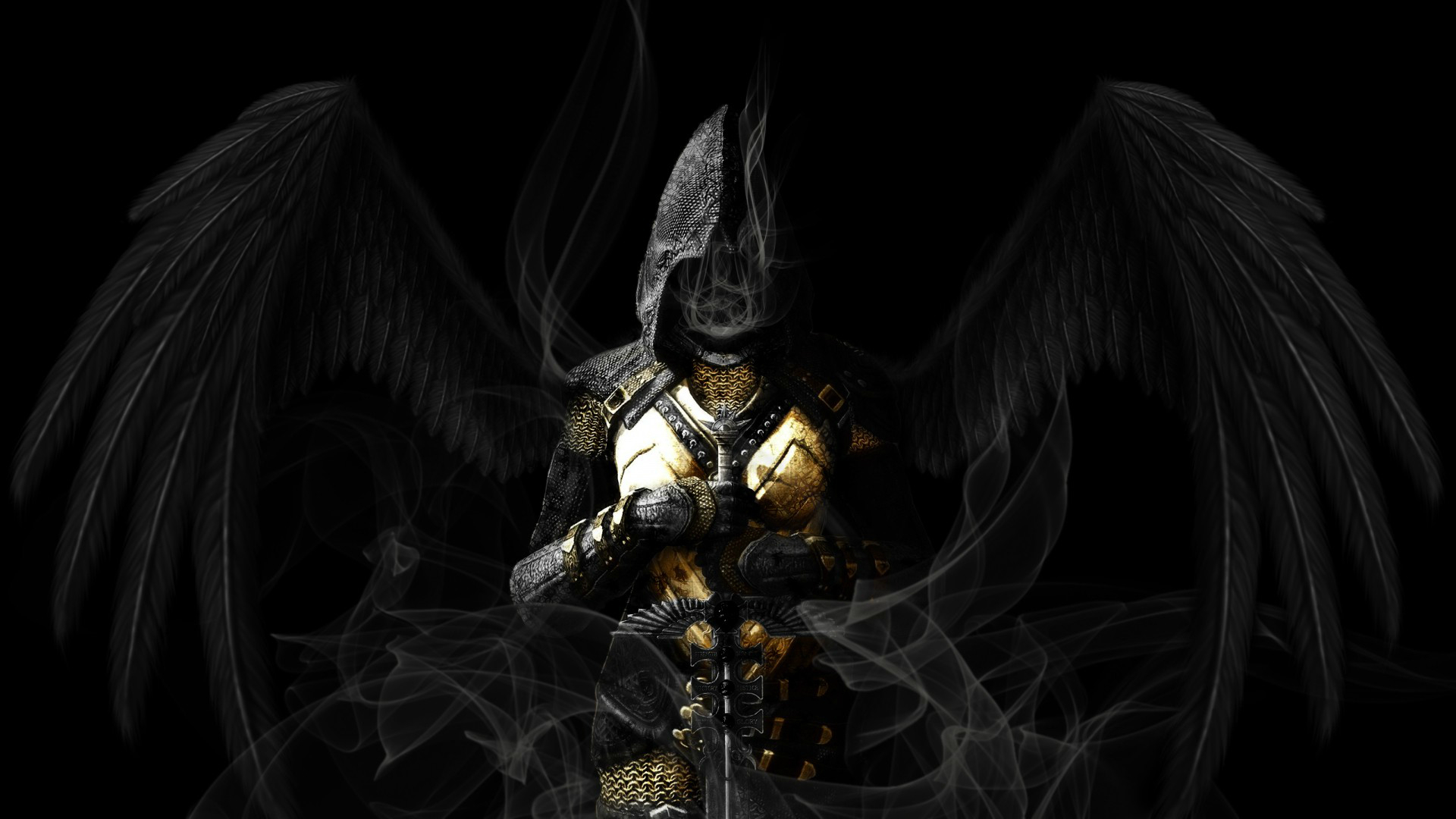 Description: A man in armor with wings on a black background with smoke in the air and a black background with a black background.