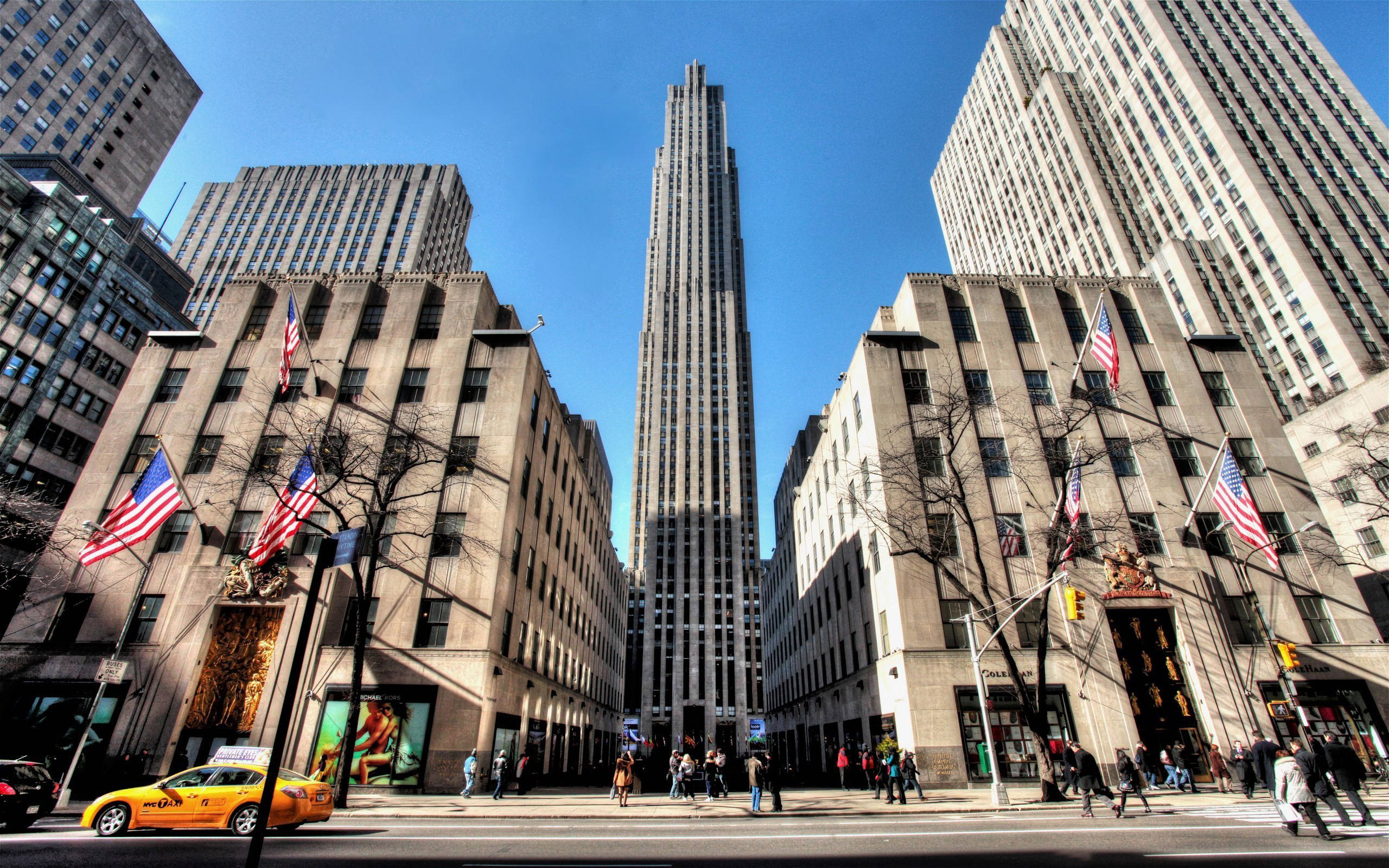 Description: A tall building with a spire in the middle of a city street with people walking around it and a taxi cab in front of it.