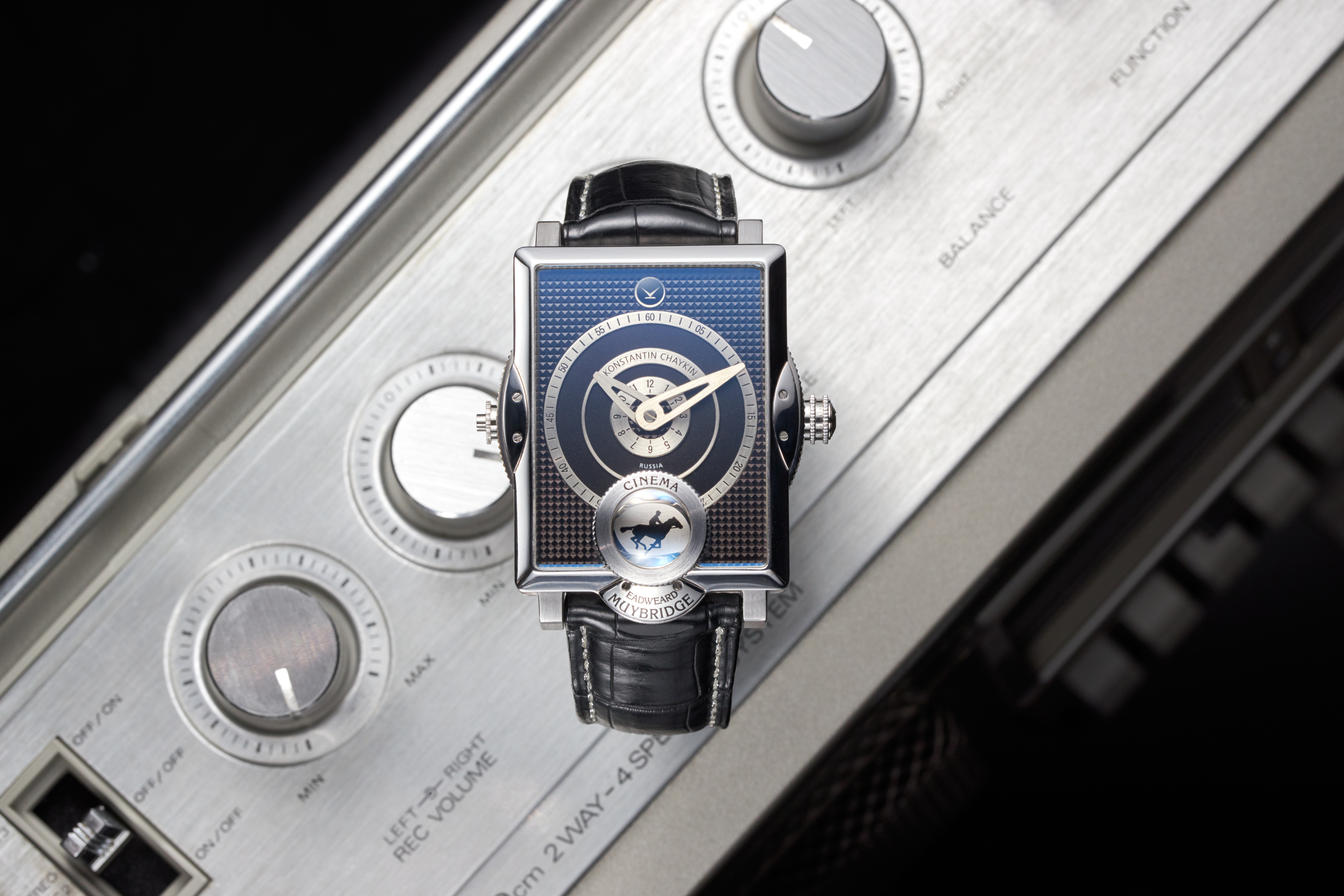 Description: A watch with a blue dial and black leather strap on a metal surface with buttons and numbers on it.
