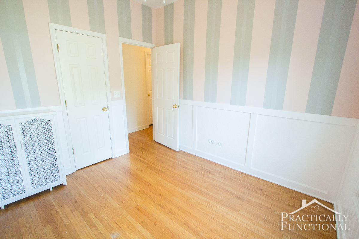 Description: A room with a hard wood floor and striped wallpaper on the walls and a radiator in the corner.