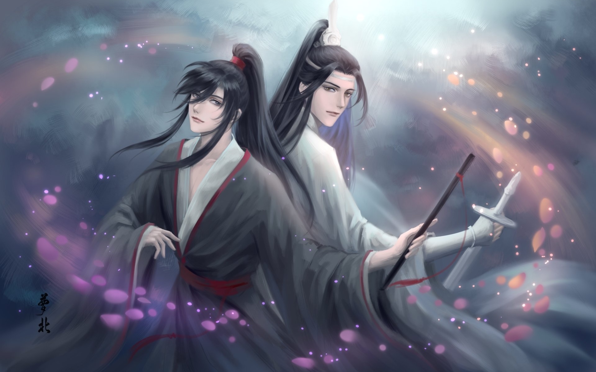 Description: Two asian women holding swords in their hands and a sky background with stars and clouds behind them.