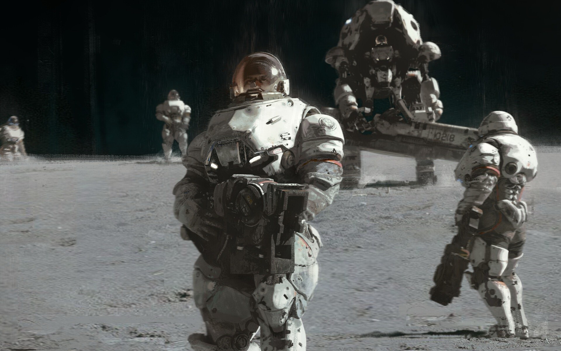 Description: A group of astronauts walking on the moon with a camera in hand and a camera in the other hand.