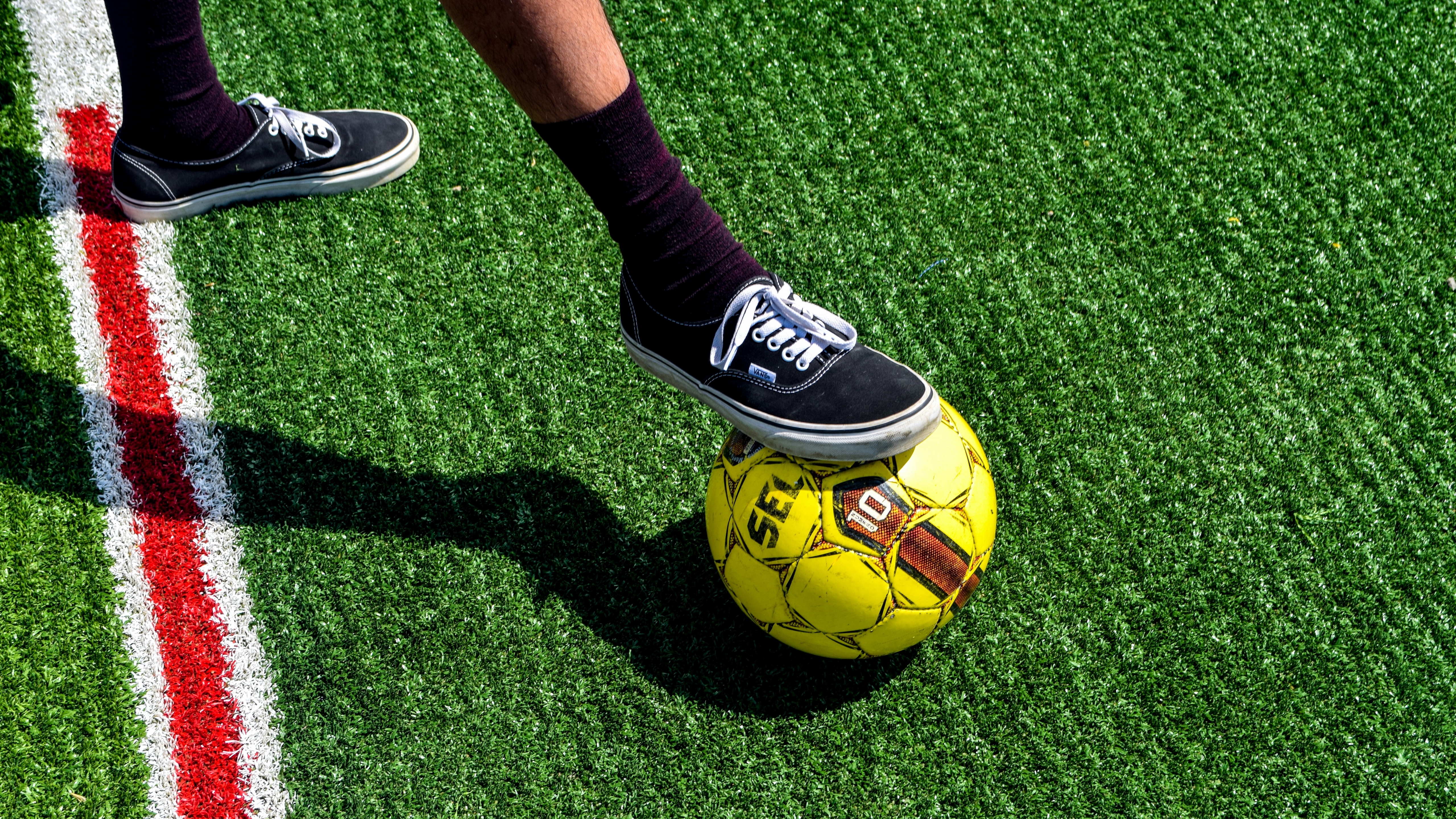 Description: A person standing on a soccer ball on a field with grass and a red and white line behind them.