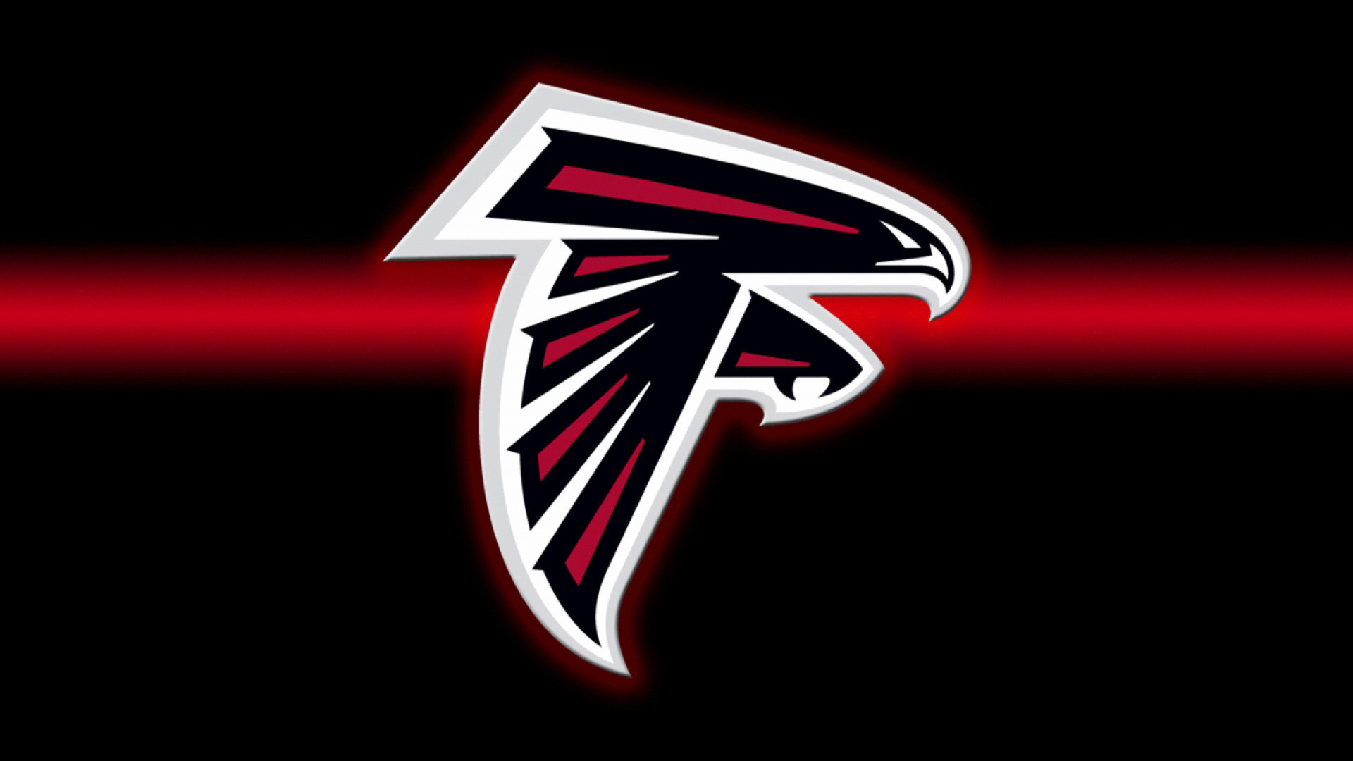 Description: A atlanta football team logo on a black background with a red stripe in the center of the image and a black background with a red line.