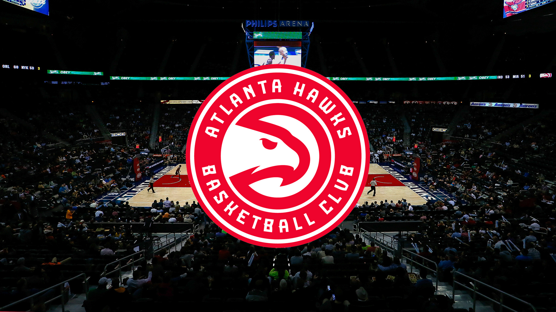 Description: A atlanta hawks basketball court with a large atlanta hawks logo on it's sideline and fans in the stands.