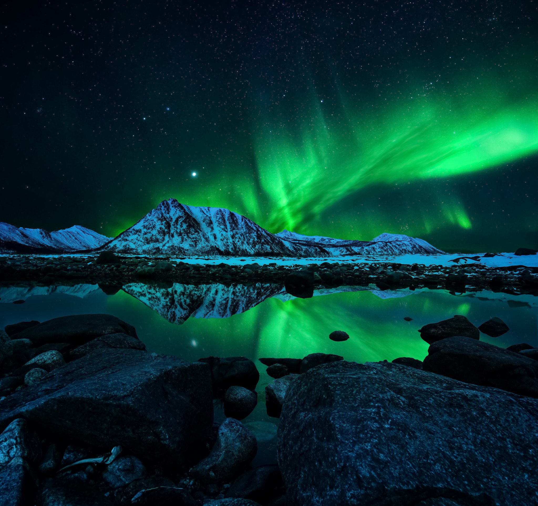 Description: A green and blue aurora bore over a mountain range and a lake with rocks in the foreground and a reflection of the sky in the water.