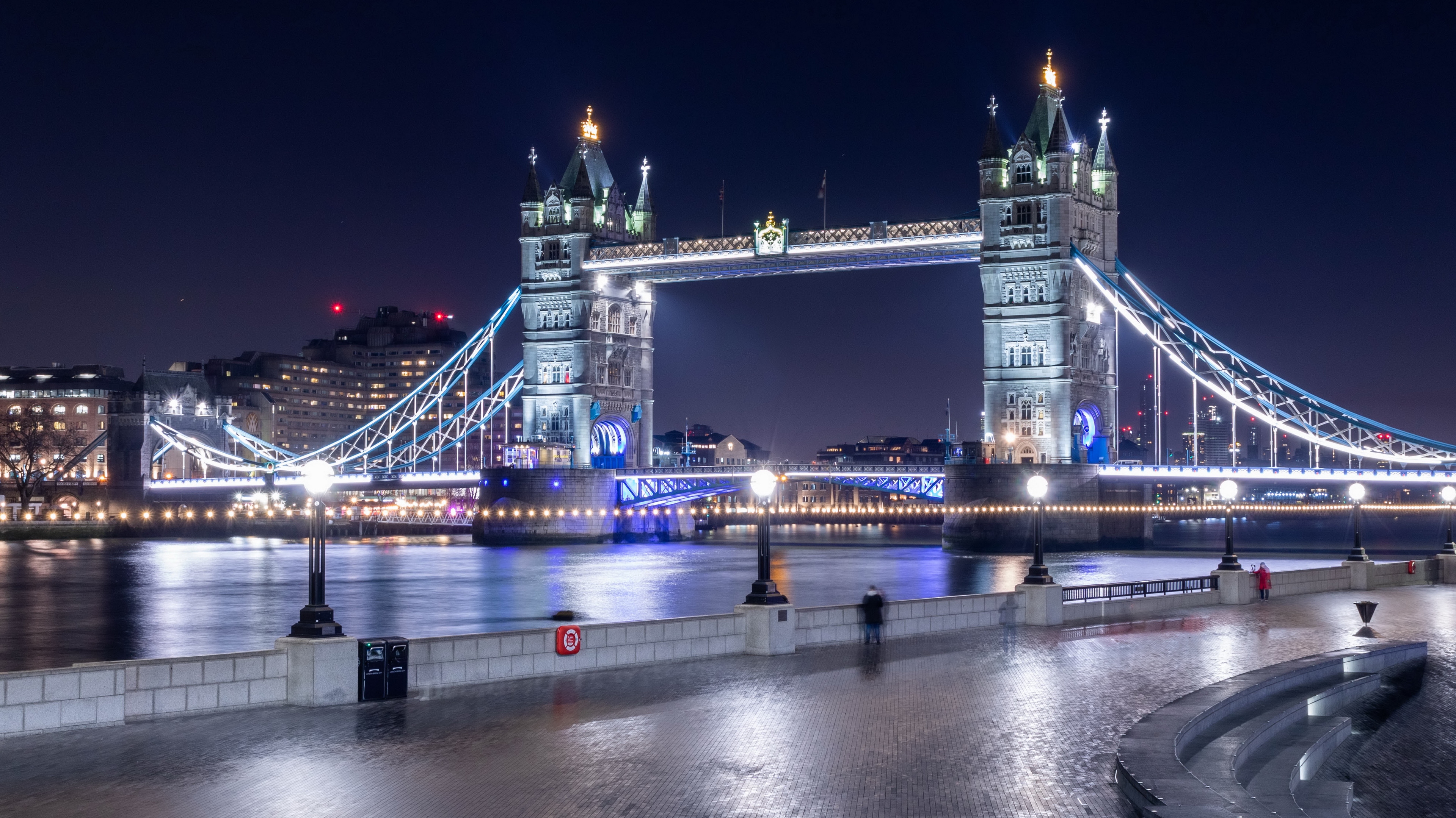 Description: A night view of a bridge over a river with lights on it and a city in the background with a few buildings.