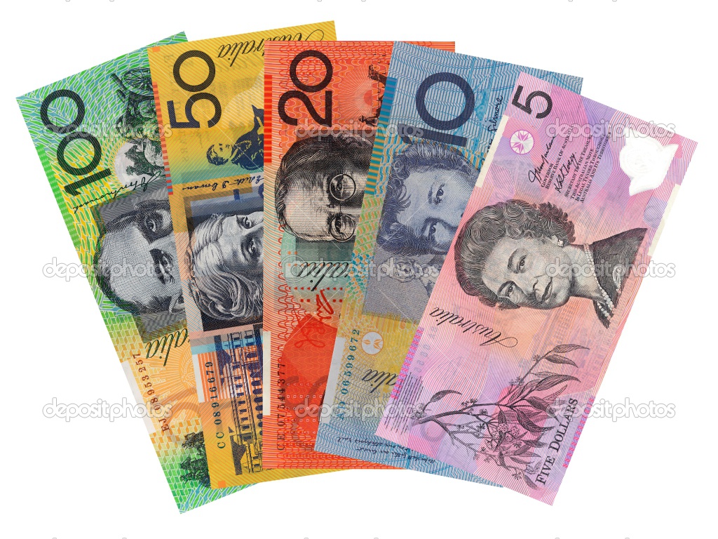 Description: A group of five different australian currency notes on a white background stock photo - images of australian currency.