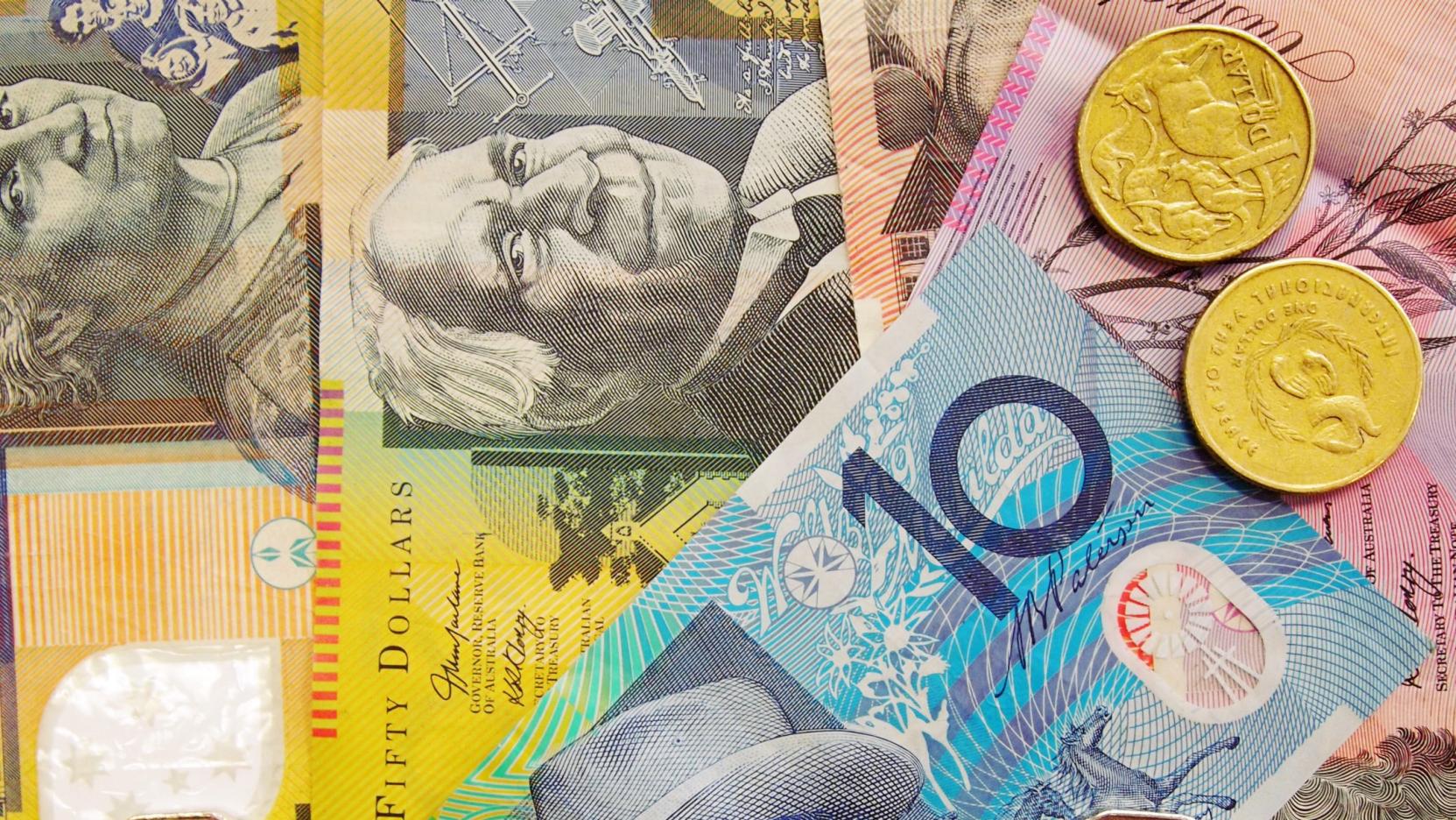 Description: A pile of australian money with a few coins on top of it and a few coins on the bottom.