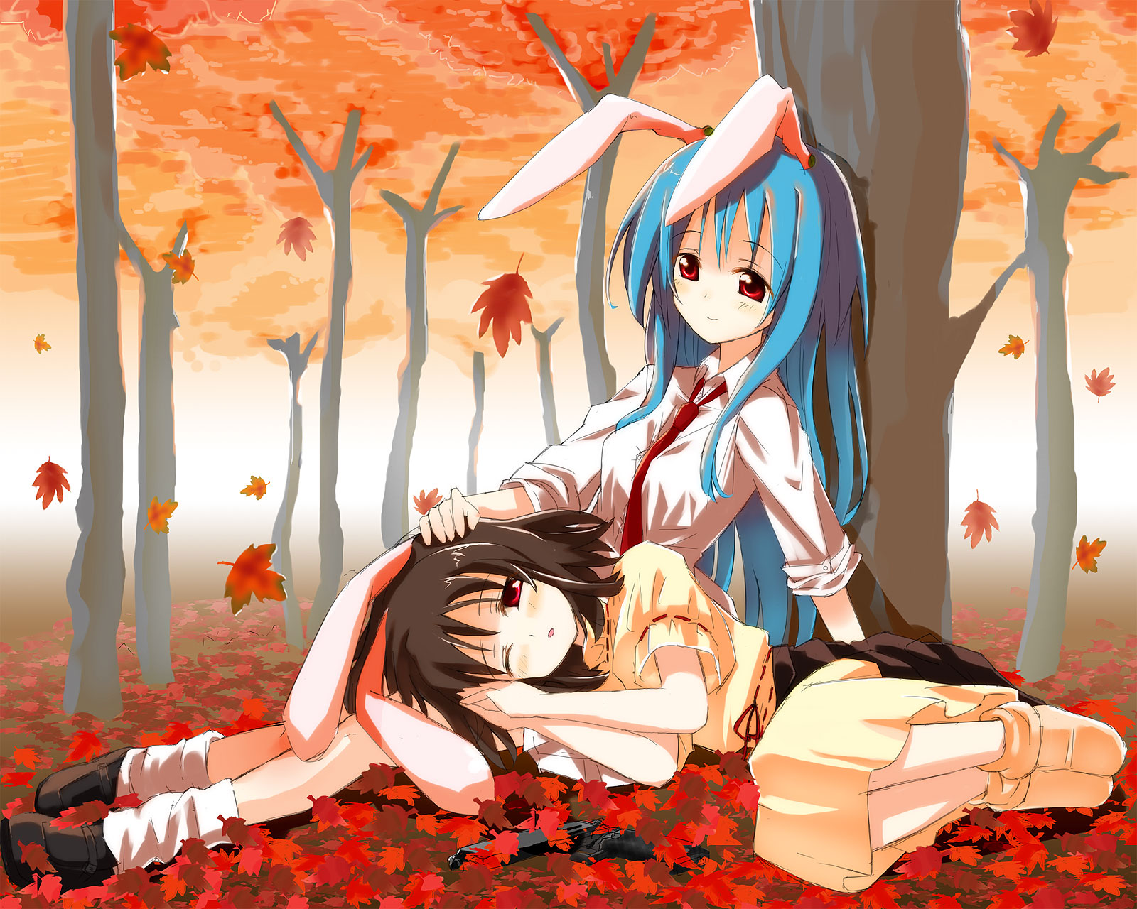 Description: A couple of anime characters laying in the leaves of a forest with trees in the background and a rabbit on the ground.