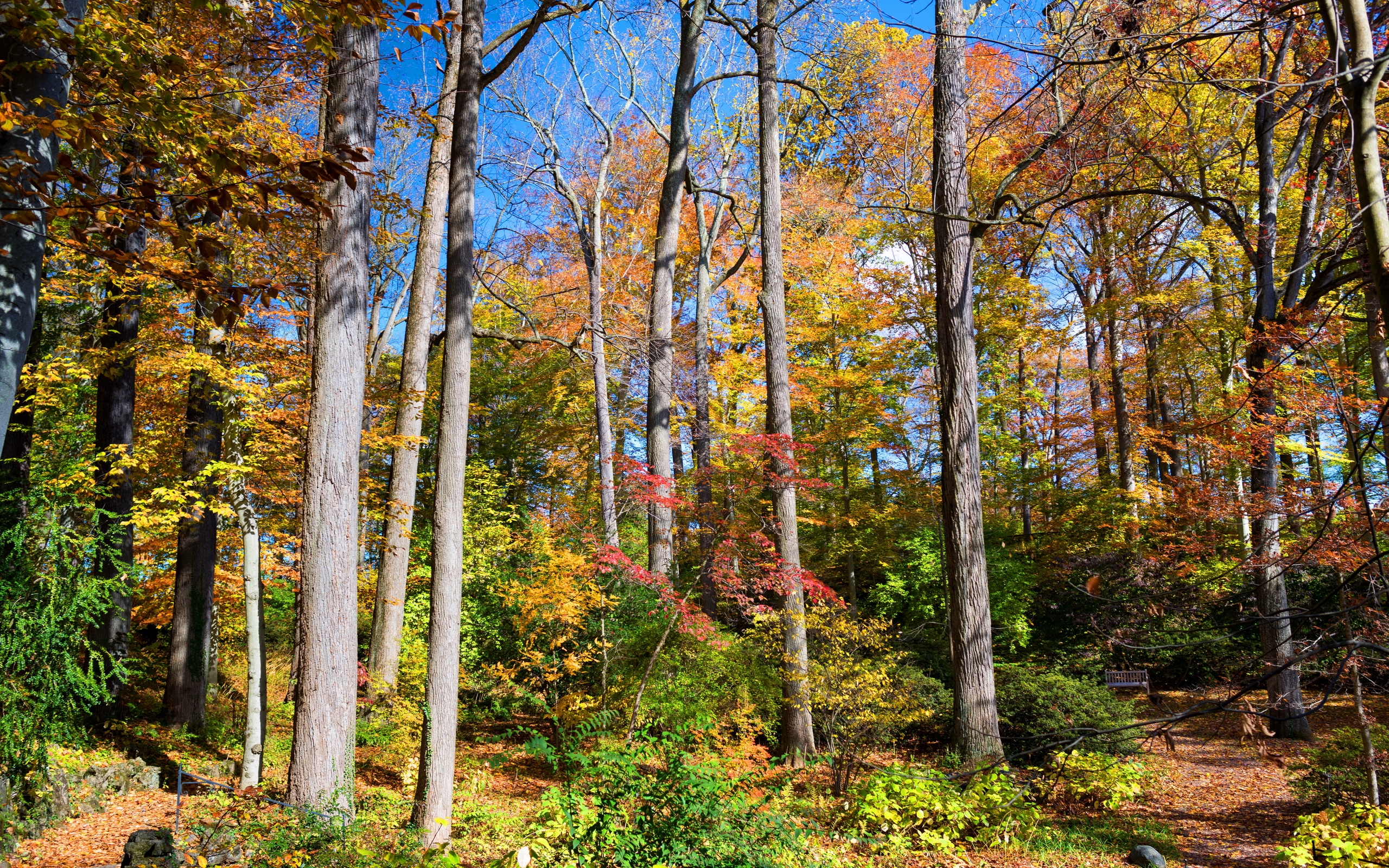 Description: A forest filled with lots of trees and lots of leaves on the ground in the fall time with a bench in the middle.