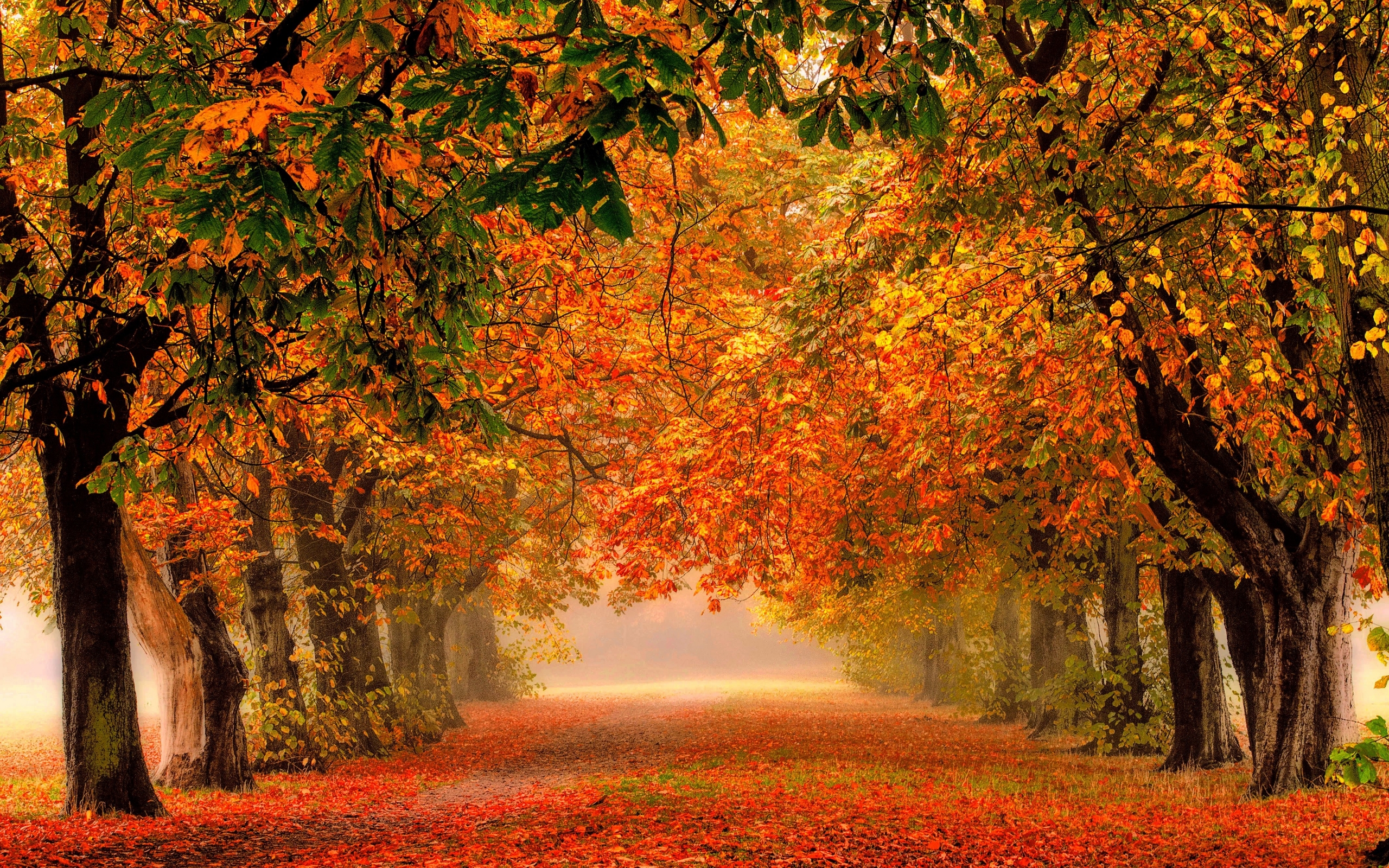 Description: A path through a forest with lots of trees covered in leaves and fall colors on the ground and in the trees.
