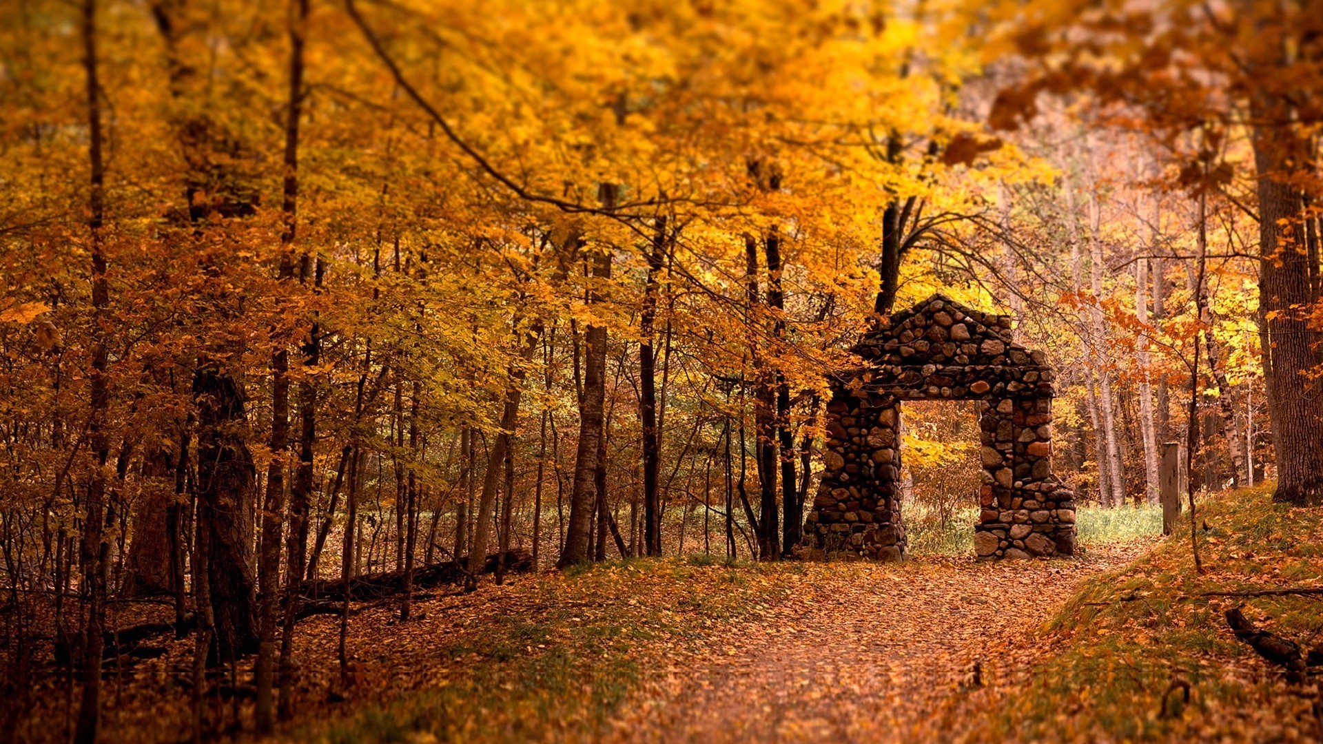 Description: A path in the woods with a small structure in the middle of it surrounded by trees with yellow leaves.