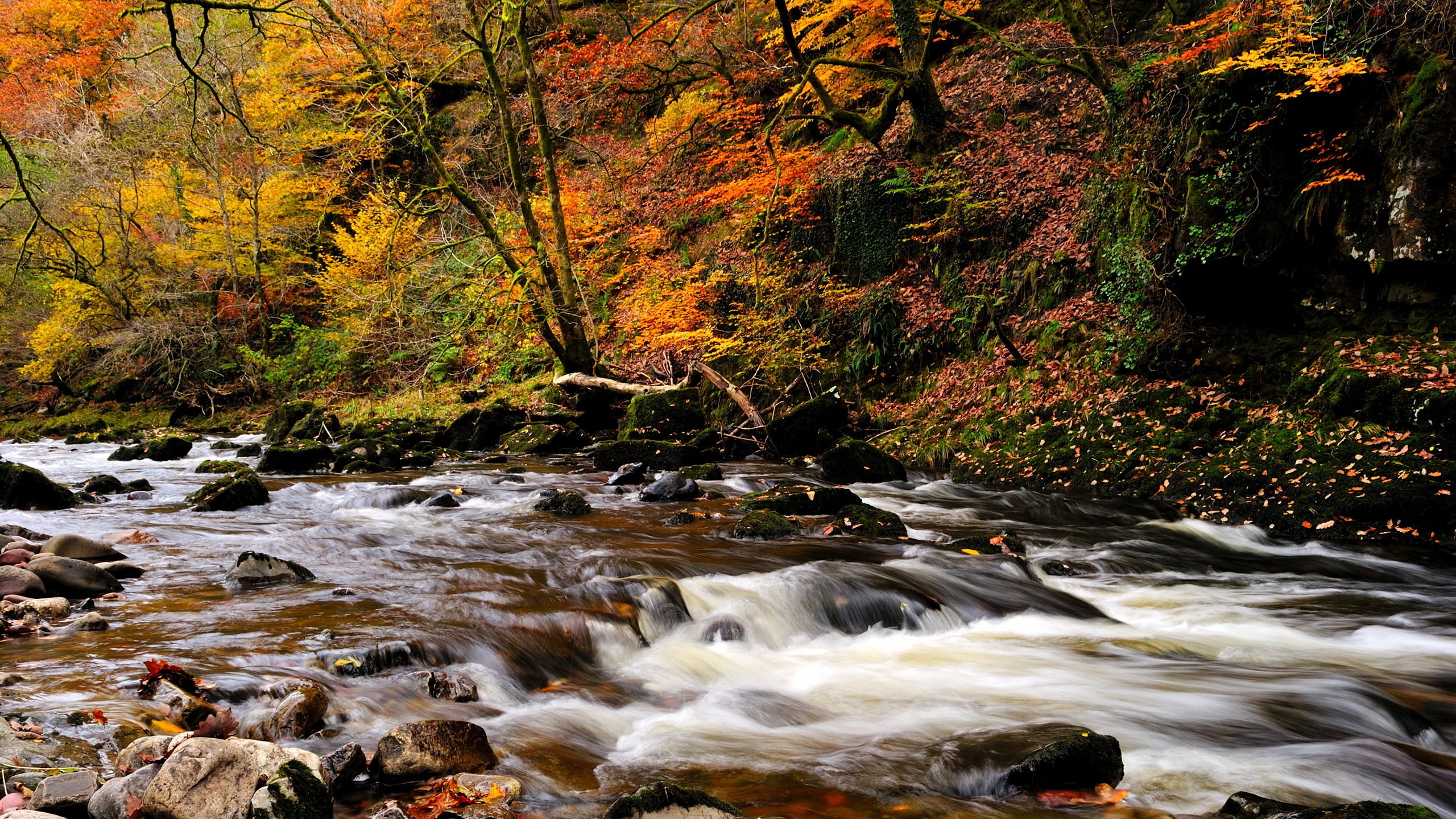 Description: A river running through a forest filled with lots of trees and rocks in autumn colors with leaves on the ground.
