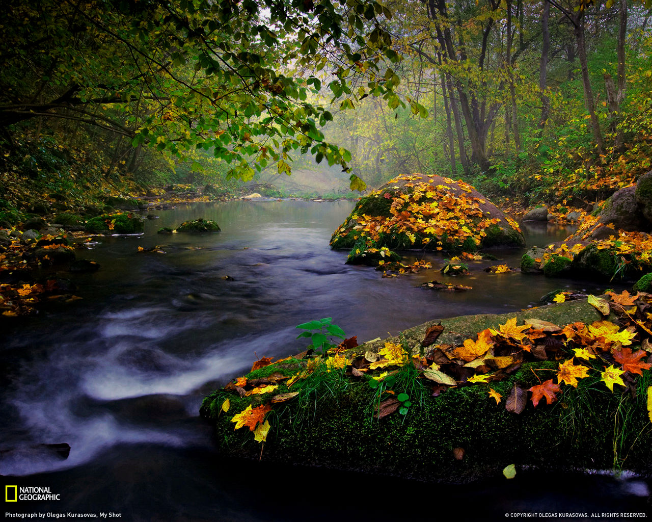 Description: A stream running through a lush green forest filled with leaves and rocks in the fall season.