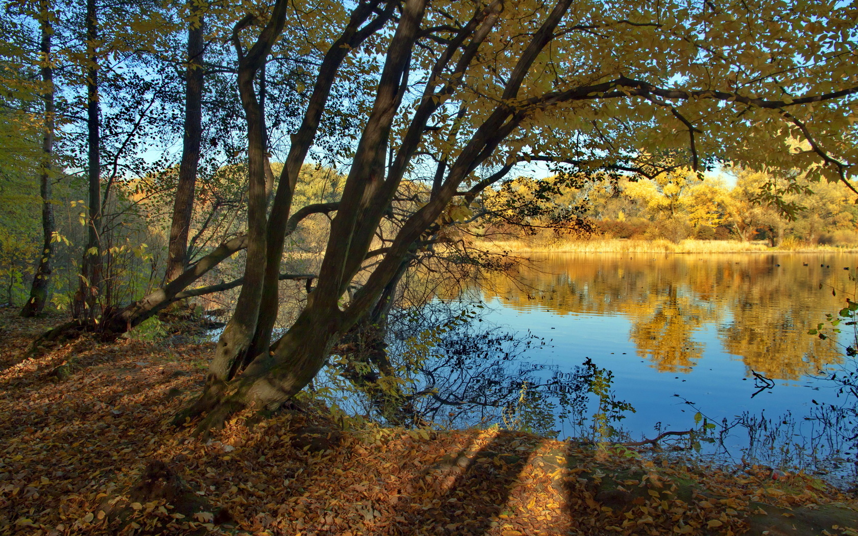Description: A lake surrounded by trees and leaves in the fall time with a few leaves on the ground and a few trees in the foreground.