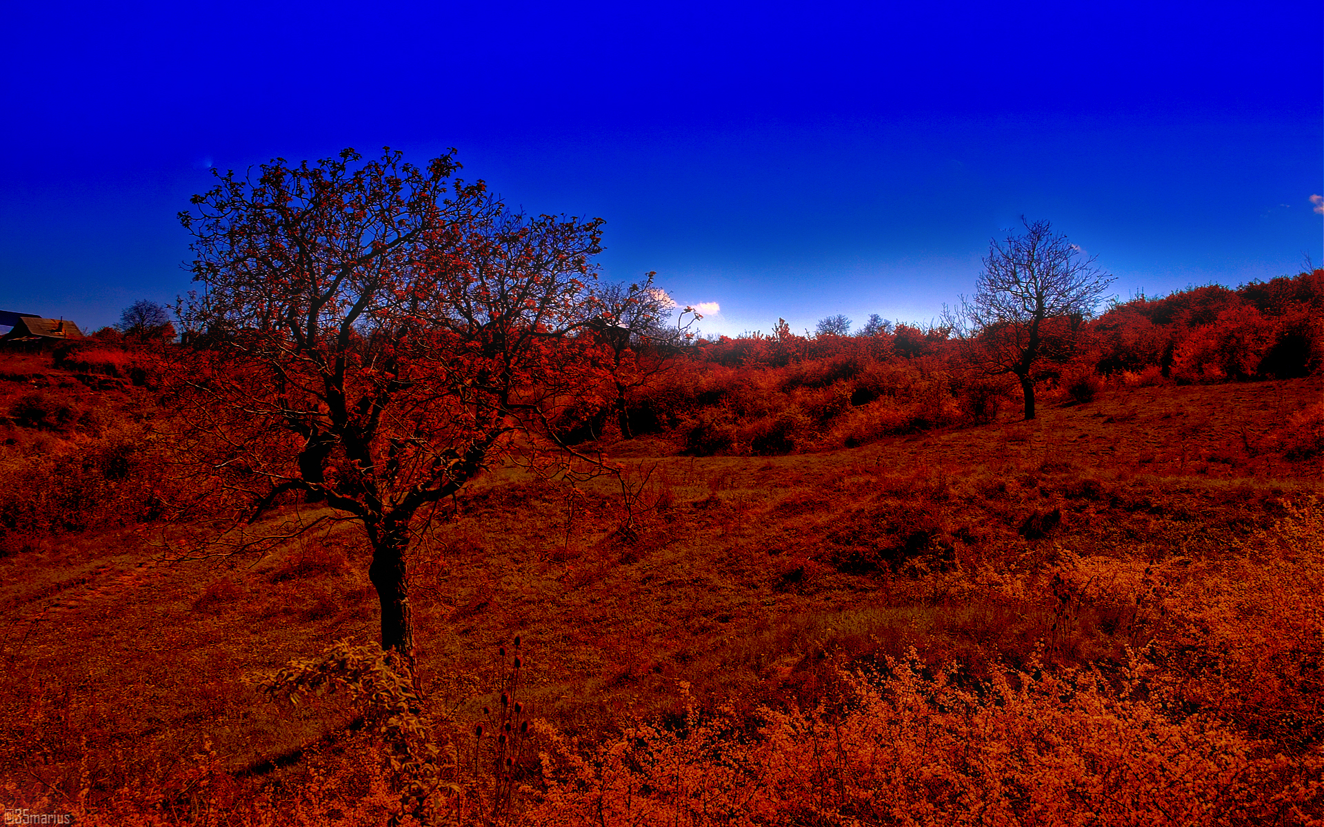 Description: A field with a tree and a house in the distance with a blue sky in the background with a few clouds.