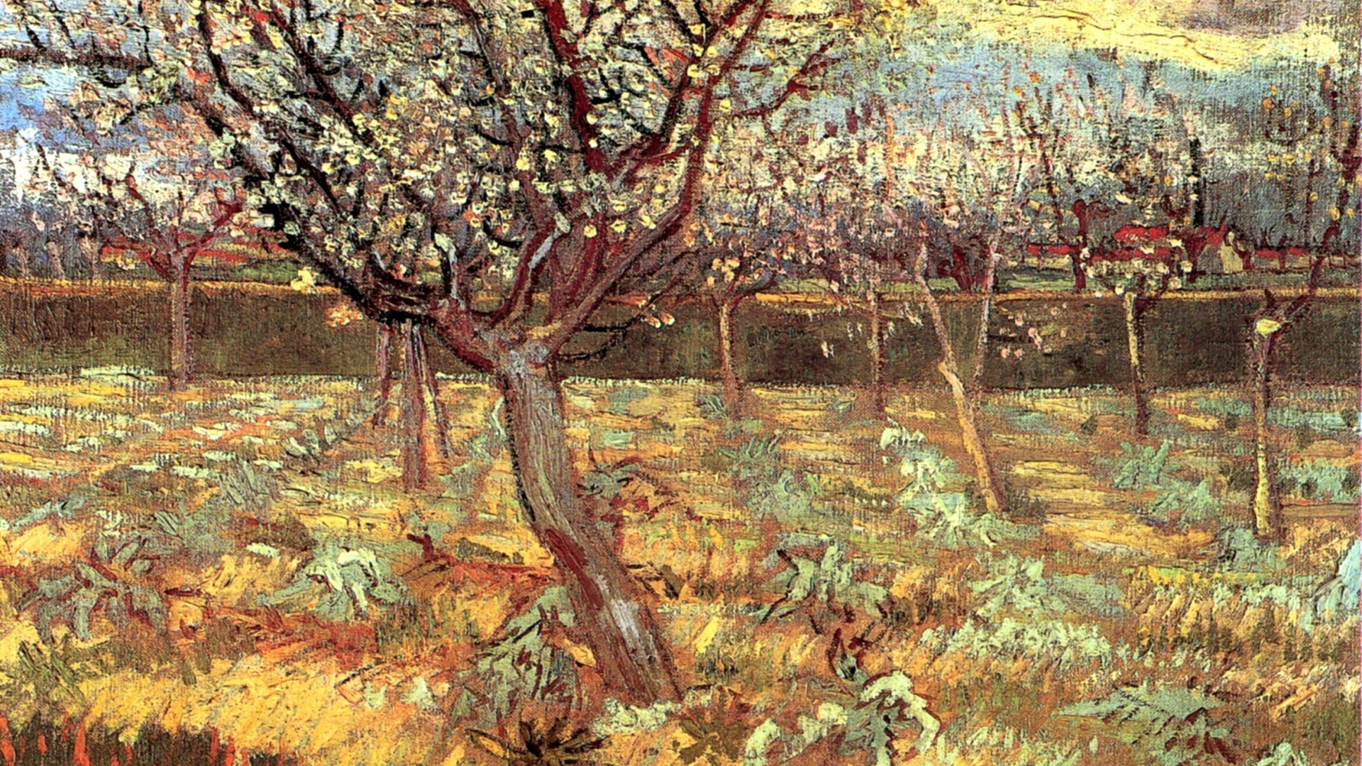 Description: A painting of a field with trees and grass in the foreground and a fence in the background with a sky in the background.