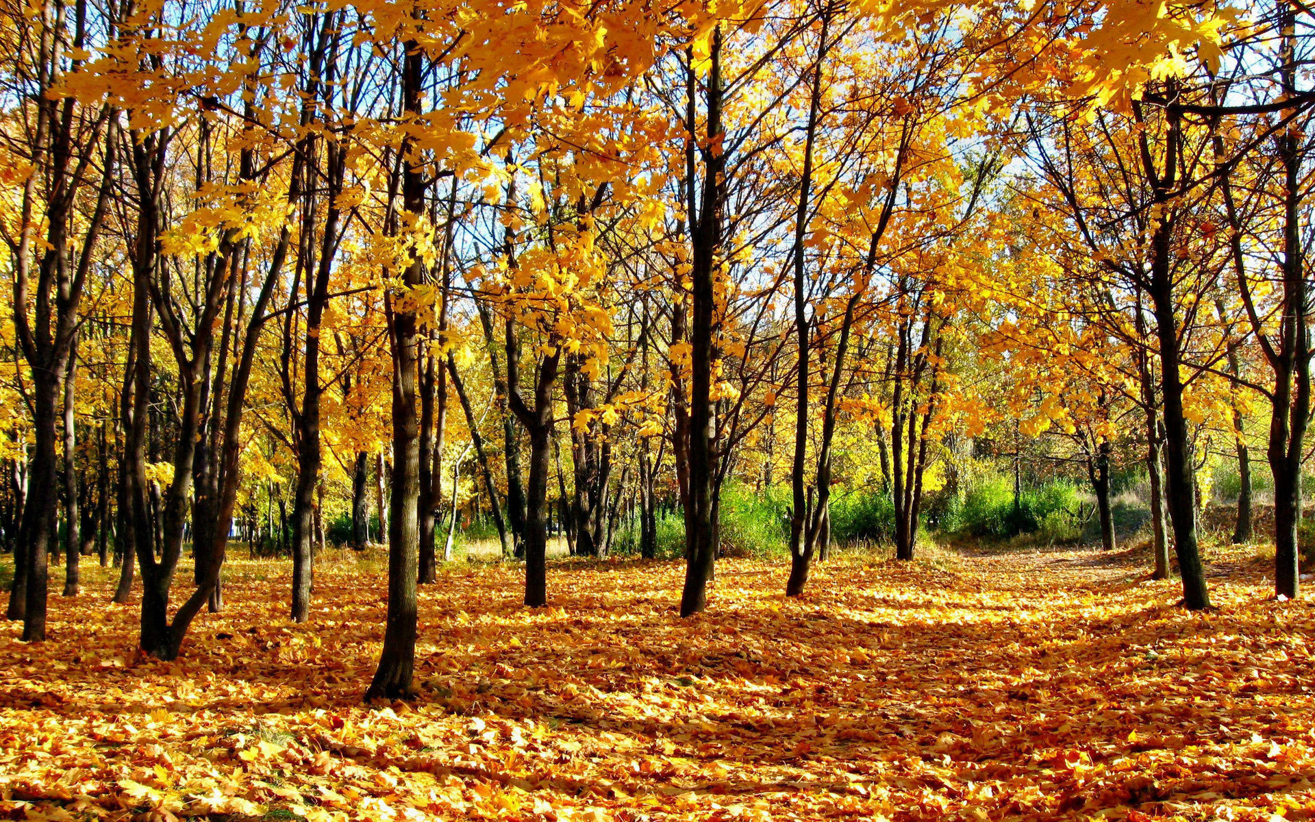 Description: A forest filled with lots of trees covered in leaves and yellow leaves on the ground and on the ground.