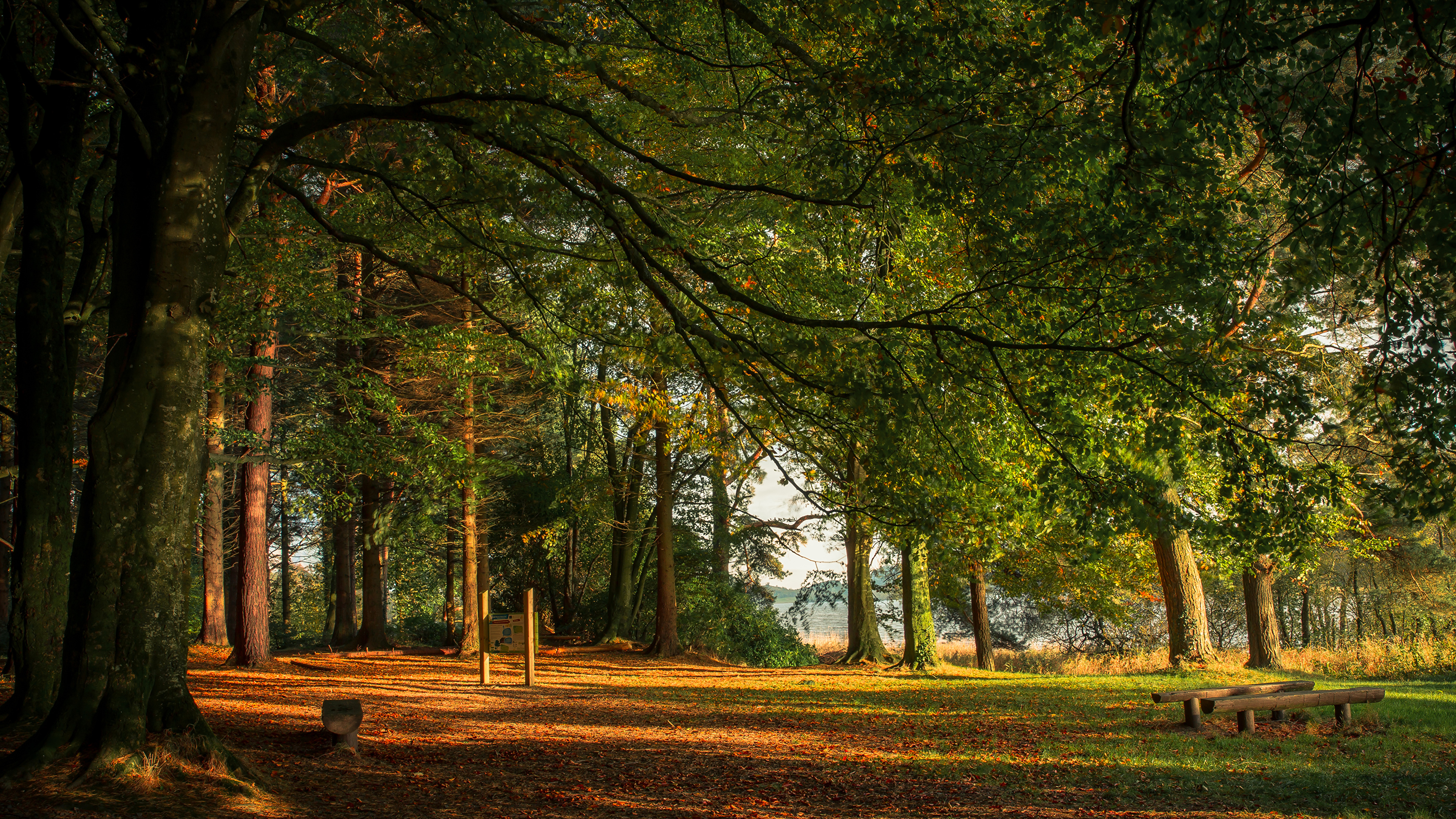 Description: A park with a lot of trees and benches in the middle of it and a lake in the background.