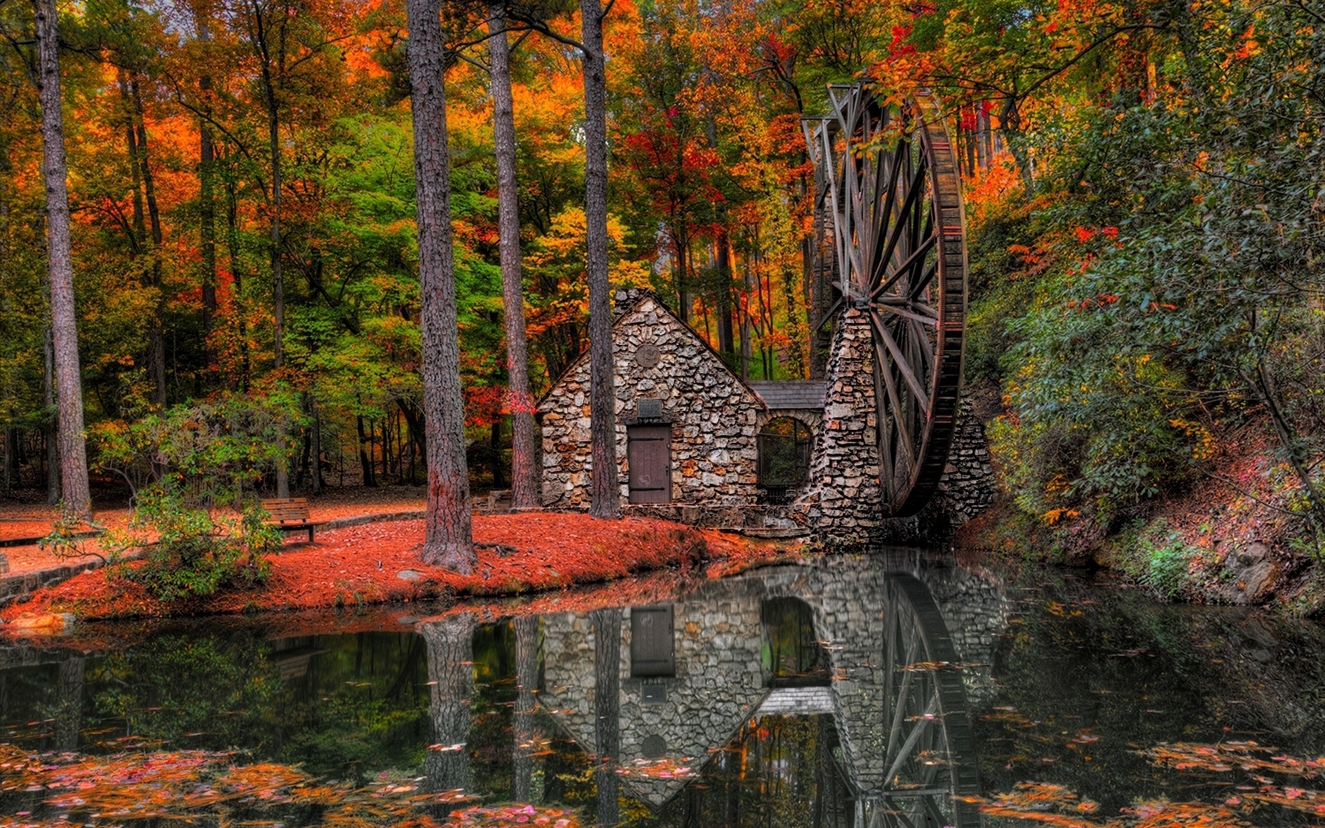 Description: A small building sitting on top of a river surrounded by trees and leaves in the fall colors of the trees.