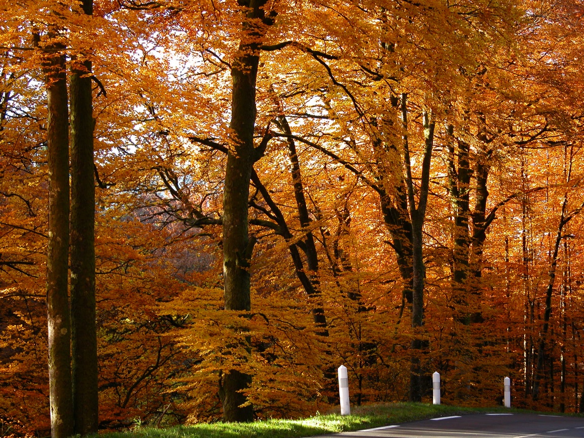 Description: A road surrounded by trees with orange leaves on it and a white traffic light on the side of the road.