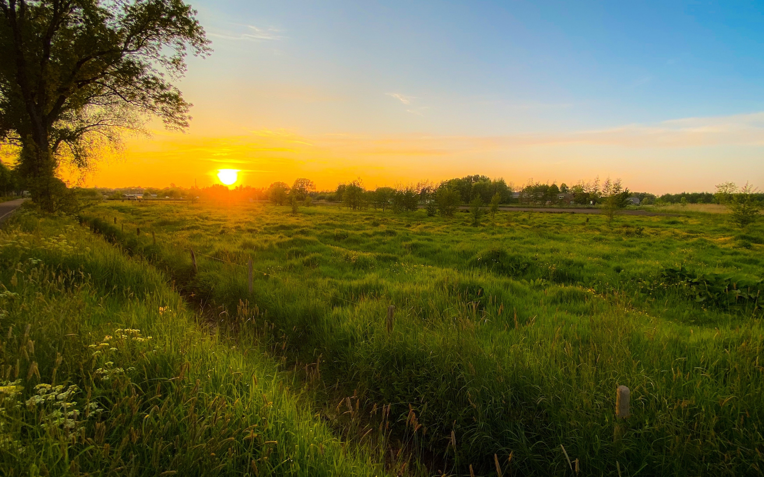 Description: A field with a path leading to a tree and a sunset in the background with a few clouds in the sky.