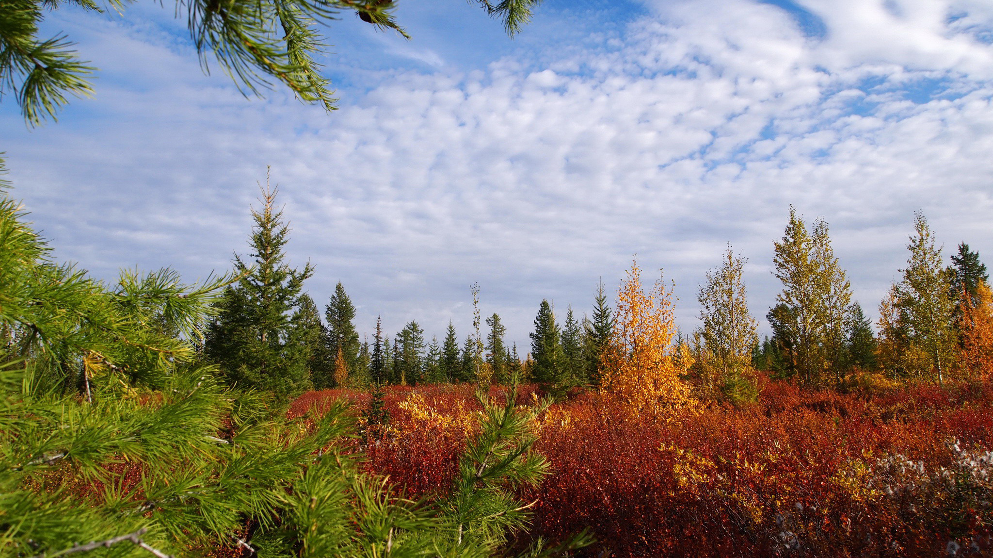 Description: A field with trees and bushes in the background and a blue sky with clouds above it and a few clouds in the sky.