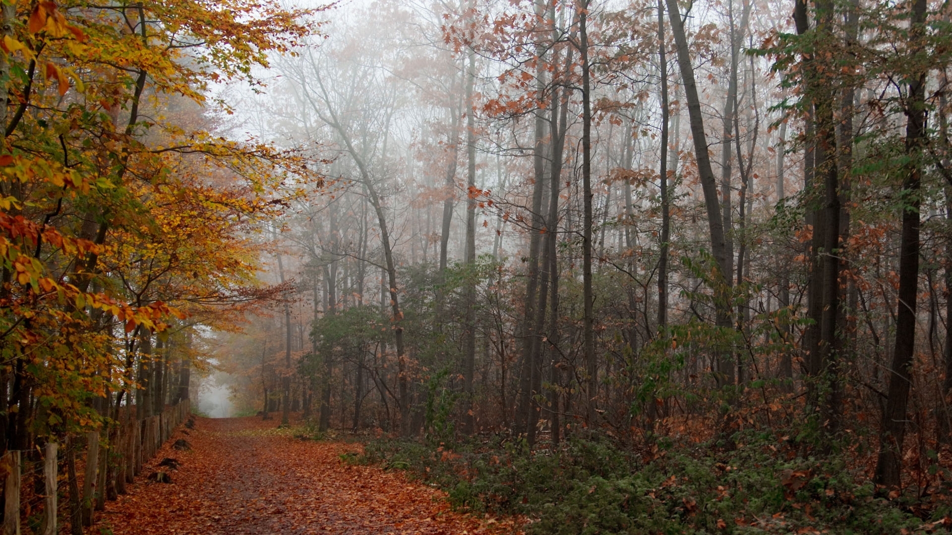 Description: A path in the woods with trees and leaves on the ground and fog in the air above it.