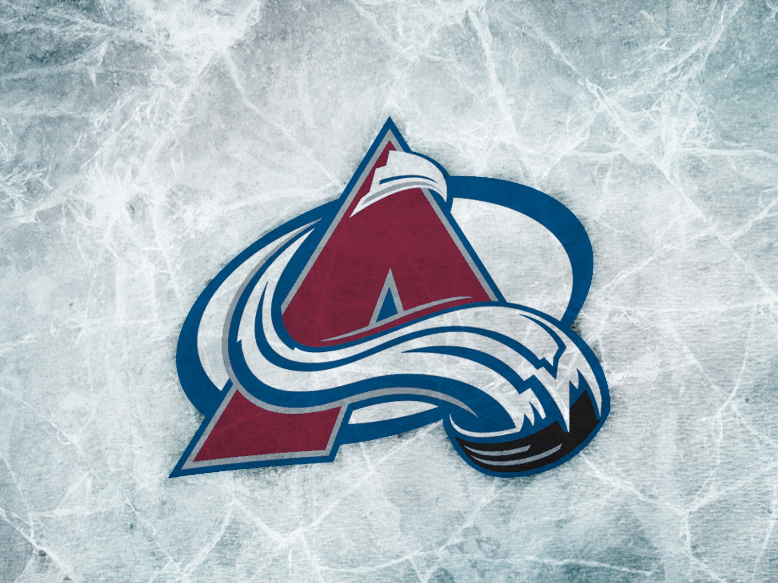 Description: A logo of the avalanche on a hockey rink with ice behind it and a hockey sticker on the bottom of the logo.