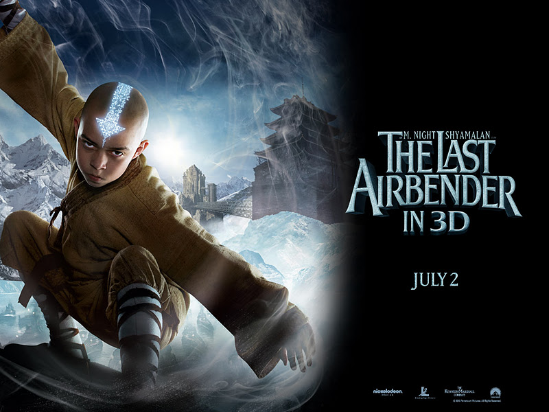 Description: A character from the movie avatar is shown in a promotional image for the last airbender in 3d.