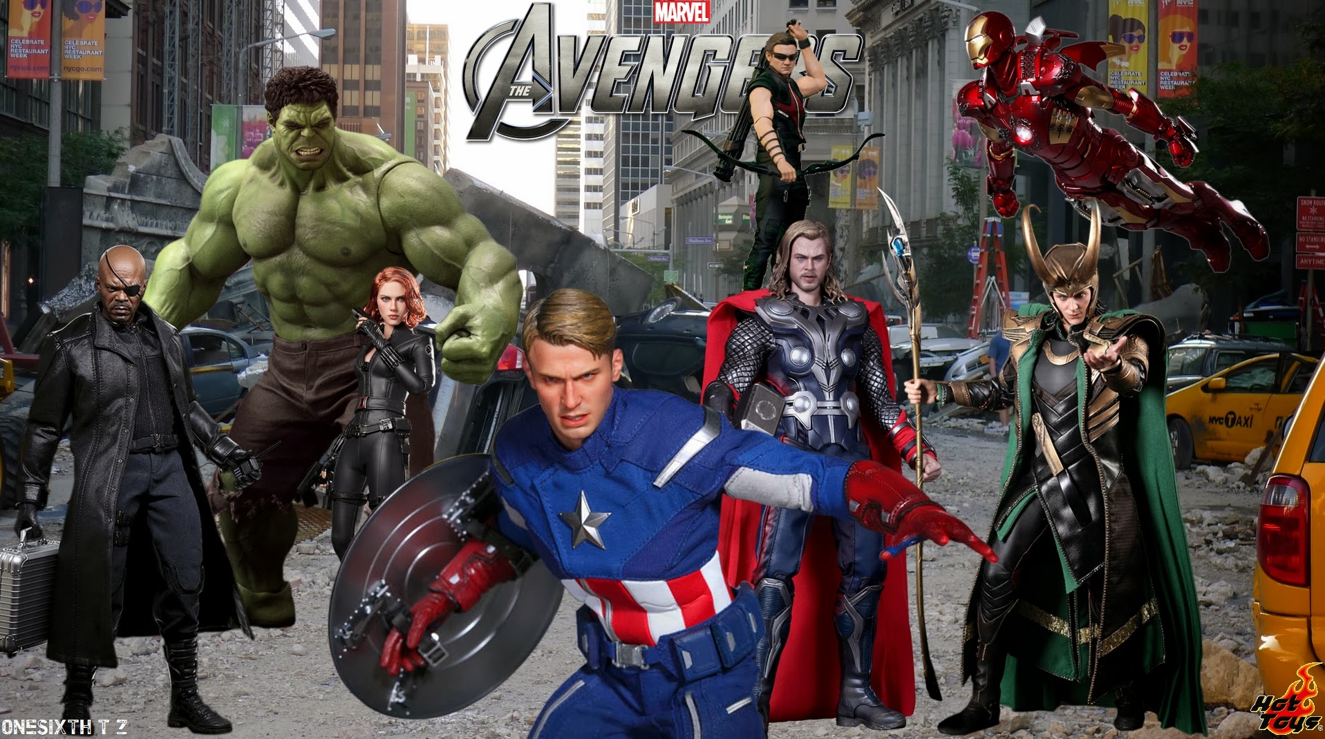 Description: A group of avengers characters standing in the street with a city background and a caption that reads.
