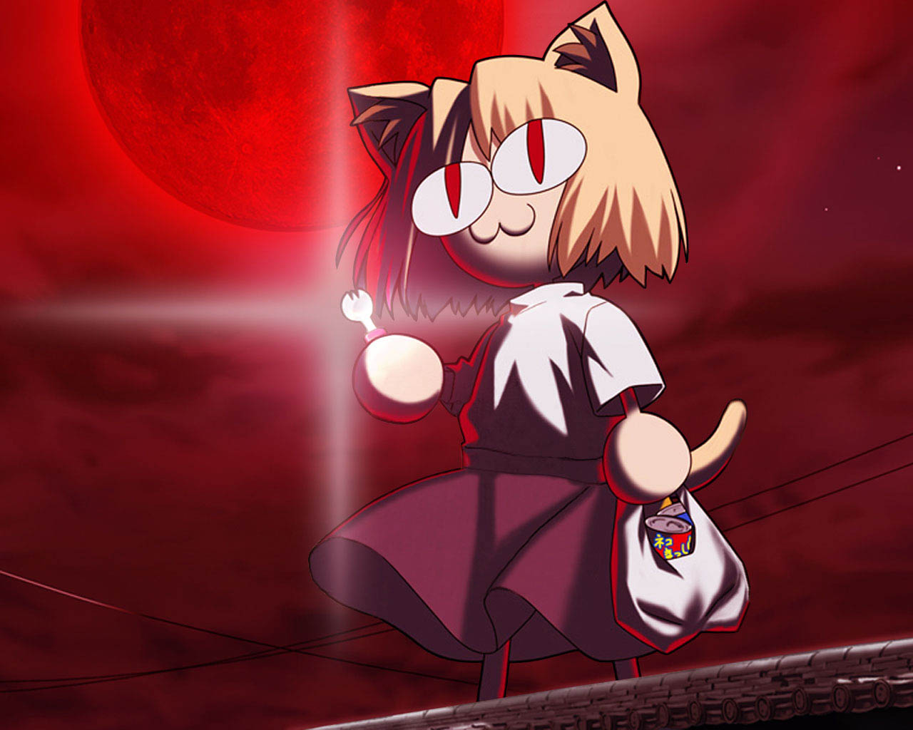 Description: A cartoon character with a cat on her shoulder and a red background with a red moon behind her and a red sky.