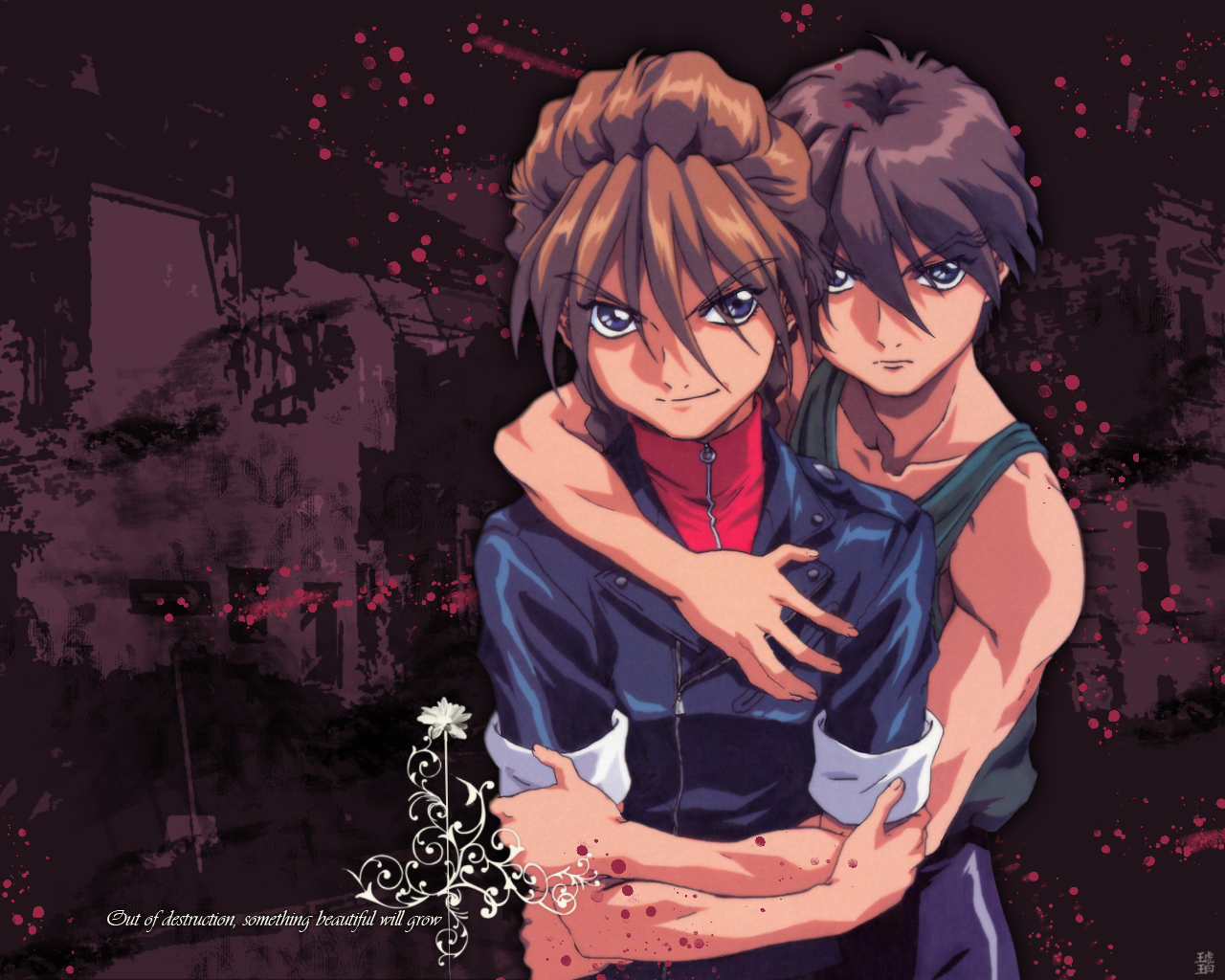 Description: Two anime characters hugging each other with a black background behind them and a red and white background behind them.