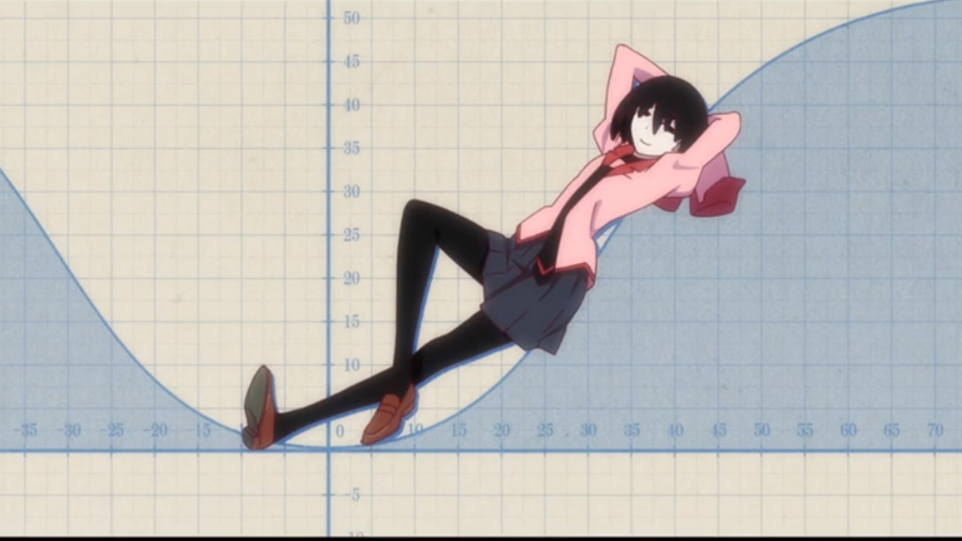 Description: A woman in a pink shirt and black pants is sitting on a blue graph paper with her legs crossed.