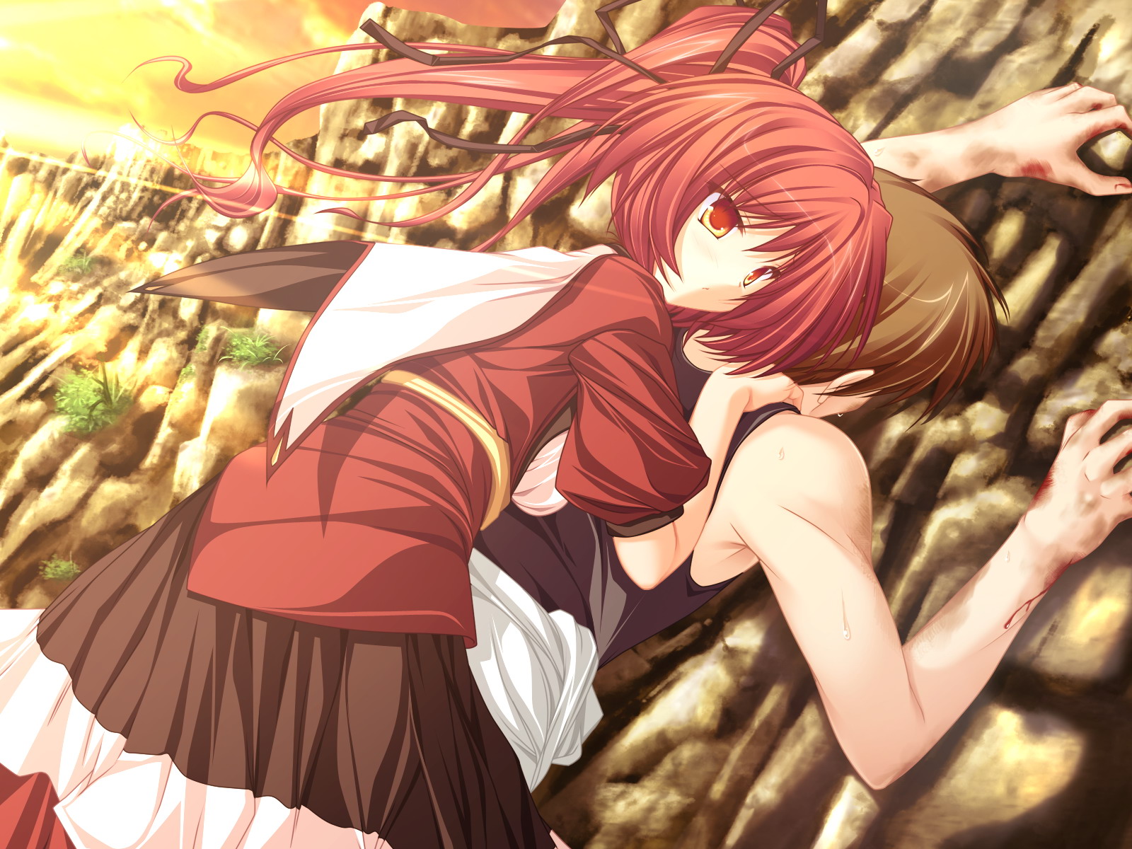 Description: A girl with red hair and a dress is standing in front of a rock wall and holding her hand out.