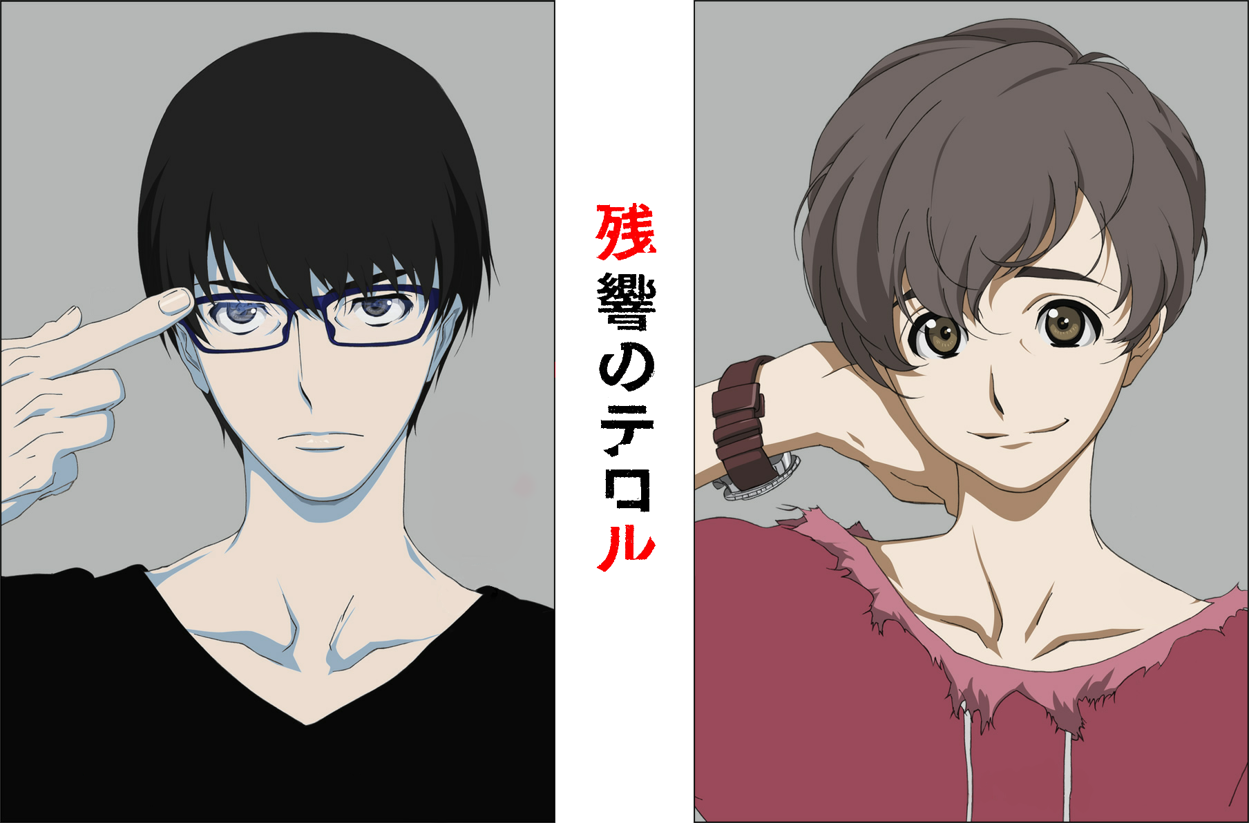 Description: Two anime characters with glasses and a red shirt with a black shirt and a red shirt with a black shirt and a red shirt with a black shirt and white shirt with a red shirt.