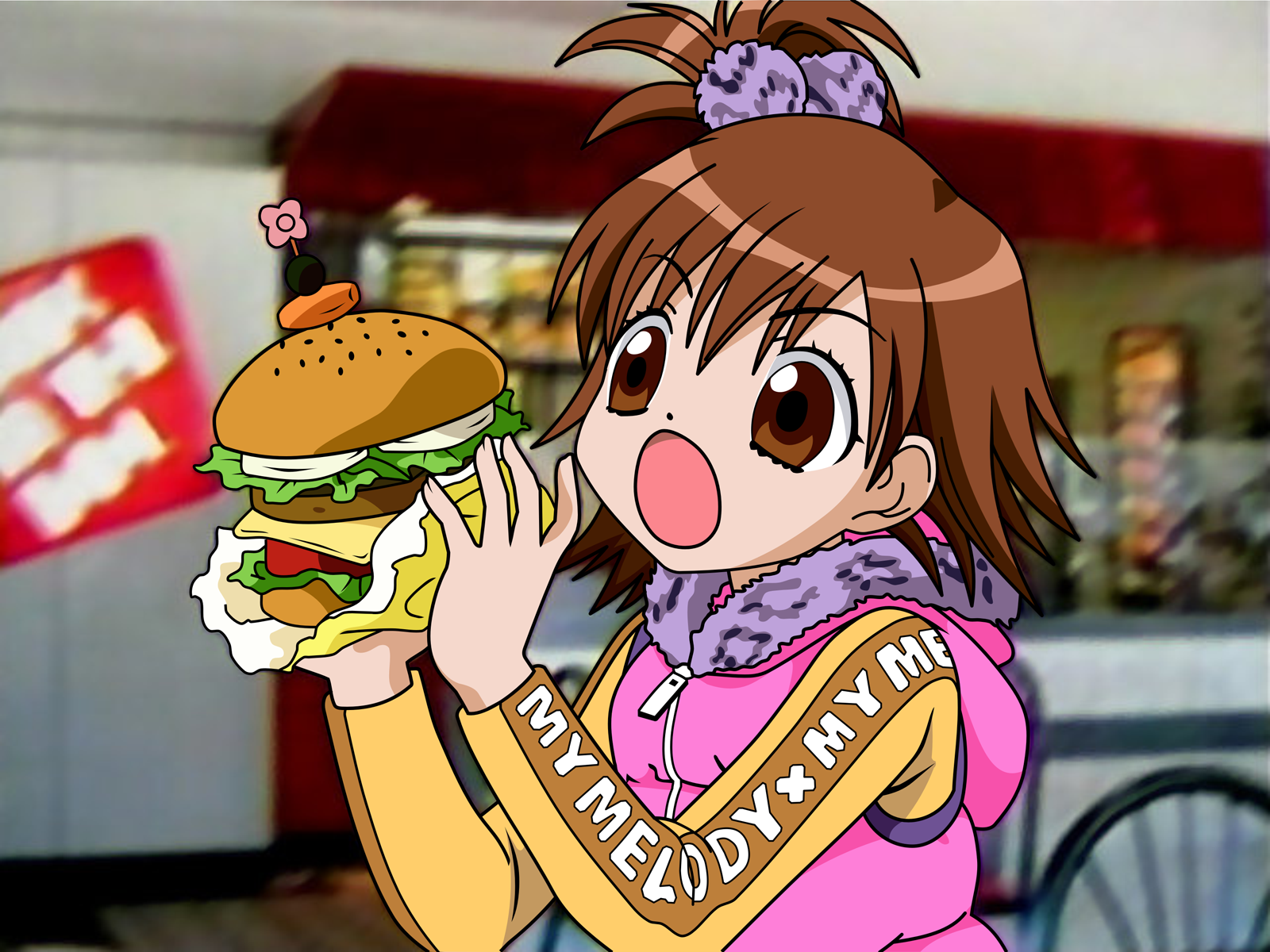 Description: A girl holding a hamburger in her hand and a hamburger in her other hand with a happy message on it.