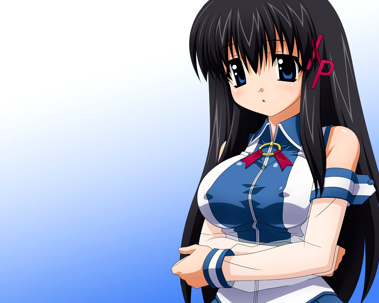 Description: A anime girl with long black hair and blue eyes is posing for a picture with her arms crossed and her eyes closed.
