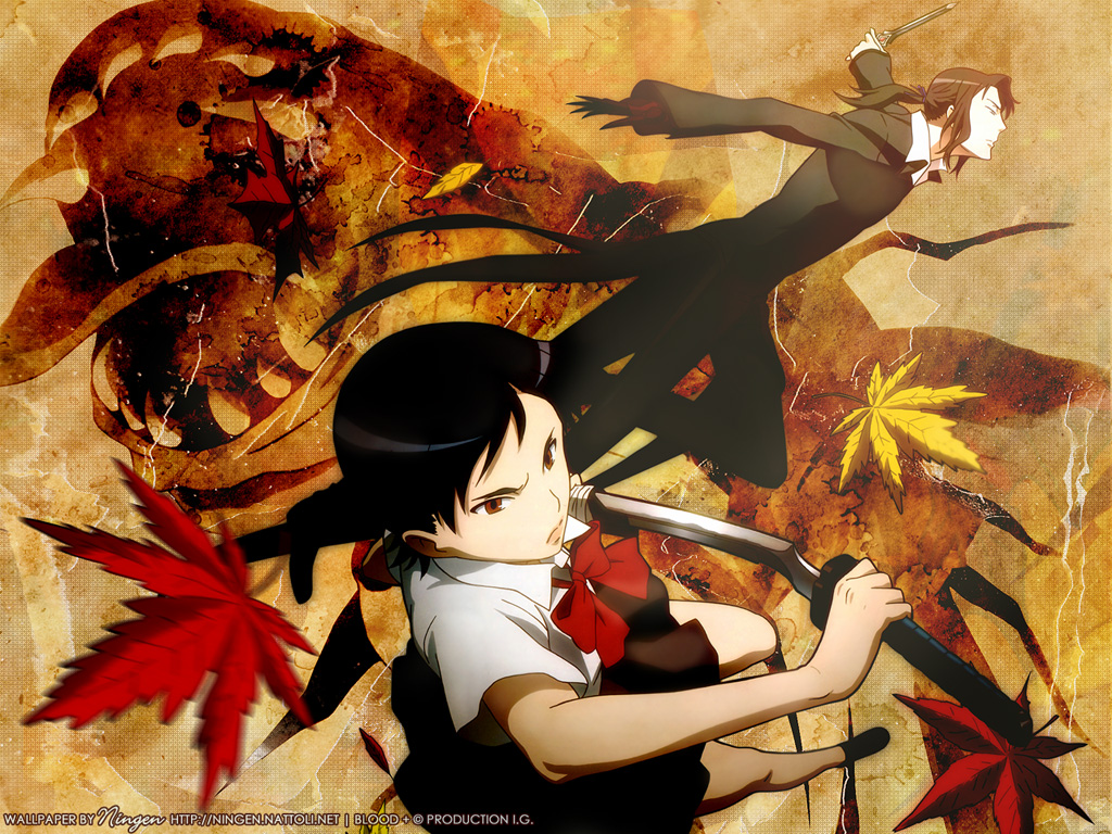 Description: A girl holding a sword in front of a painting of leaves and a demon with a long tail and a tail.