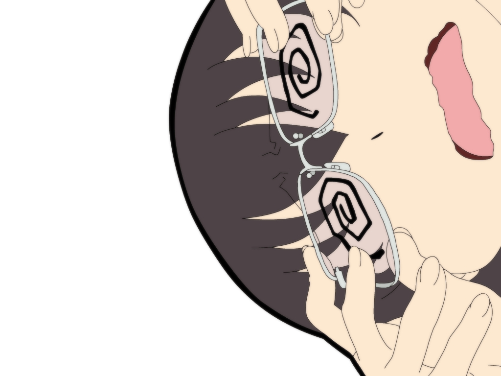 Description: A person with their mouth open holding a pair of glasses to their face with their mouth open and their eyes closed.